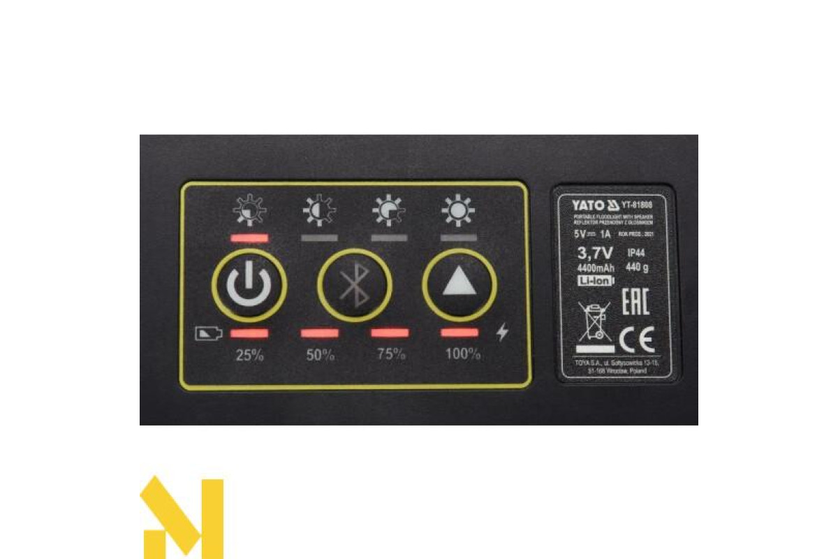 Акумуляторний ліхтар Yato 3 в 1 – чудова ідея для людей, які люблять слухати музику під час роботи чи відпочинку. Два потужні світлодіоди COB забезпечують освітлення 2000 лм, а шість режимів роботи дозволяють налаштувати їх відповідно до поточних потреб. Літій-іонний акумулятор ємністю 4400 мАг гарантує від 2,5 до 12 годин роботи та можливість використання функції Power Bank. Пристрій можна підключити, наприклад, до телефону через Bluetooth, а потім відтворювати улюблену музику завдяки якісному динаміку. Можна купити спеціальний штатив YT-81809 для цього прожектора.