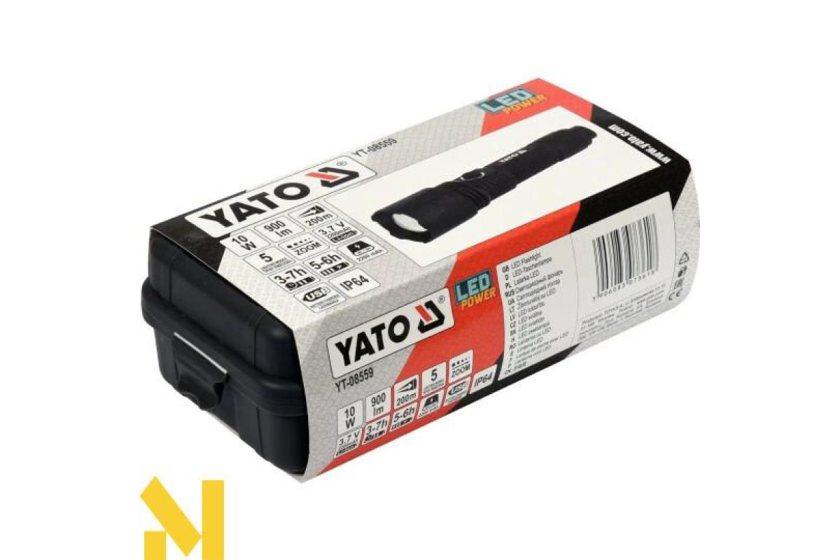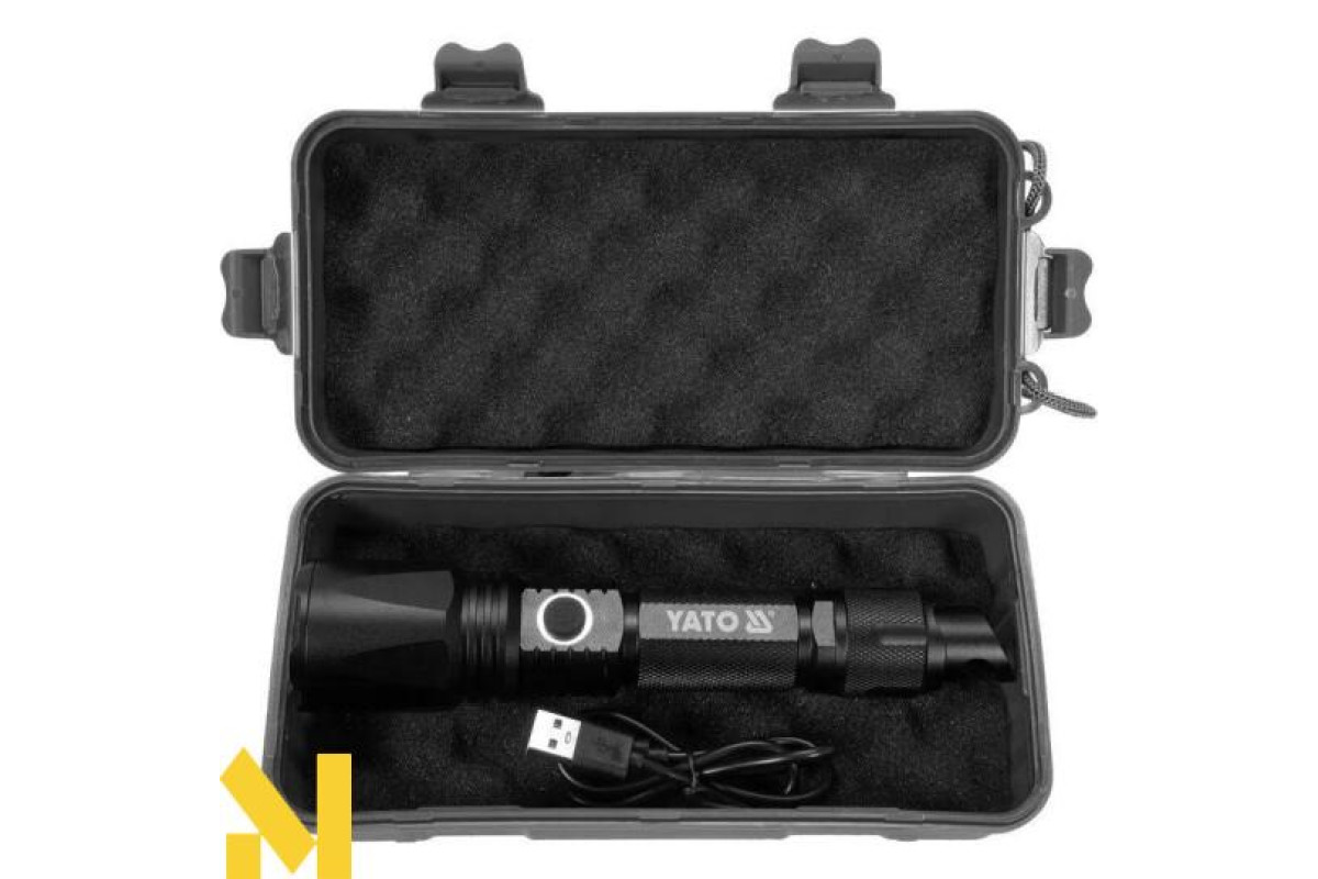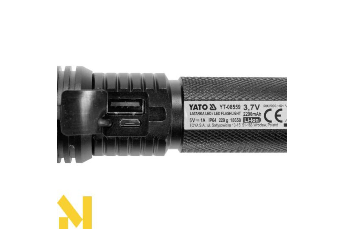 Міцний алюмінієвий ручний ліхтар YT-08559, оснащений діодом SST40, який забезпечує світло 900 лм і дальність дії 200 м. П'ять режимів роботи дозволяють регулювати освітлення в залежності від активності та рівня заряду акумулятора. Оснащений літій-іонним акумулятором 3,7 в 2200 мАг, він забезпечує до 7 годин роботи і дозволяє заряджати інші пристрої - функція Power Bank. Додатковою перевагою є унікальна підстава ліхтарика, яка може діяти як відкривачка для пляшок і молоток для розбивання вікон. Набір в міцному футлярі з зажимами полегшить зберігання і транспортування, а також стане відмінним подарунком.