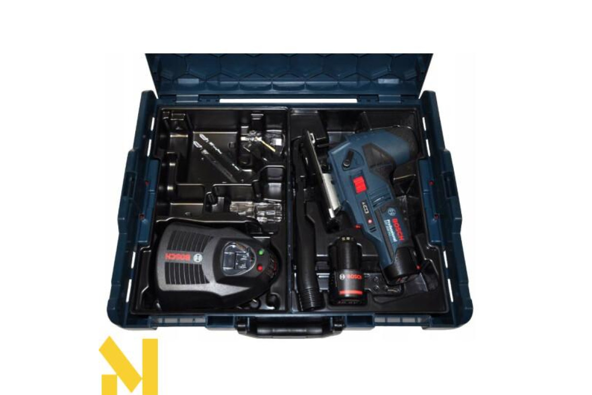 Лобзик Bosch GST 12V-70 Professional на літій-іонної акумуляторної батареї 12 В ємністю 2,0 А*год. Довжина ходу 18 мм. Глибина різу в деревині до 70 мм, в алюмінії, сталі - до 3 мм. Регульована частота ходів від 1500 до 2800 хід / хв. Три ступені маятникового коливання. Кут різу зліва і справа - 45 градусів.