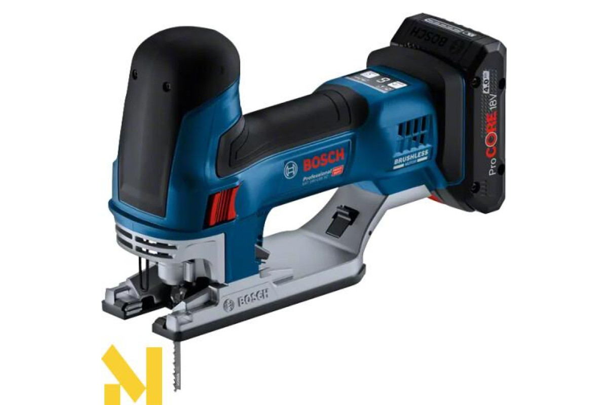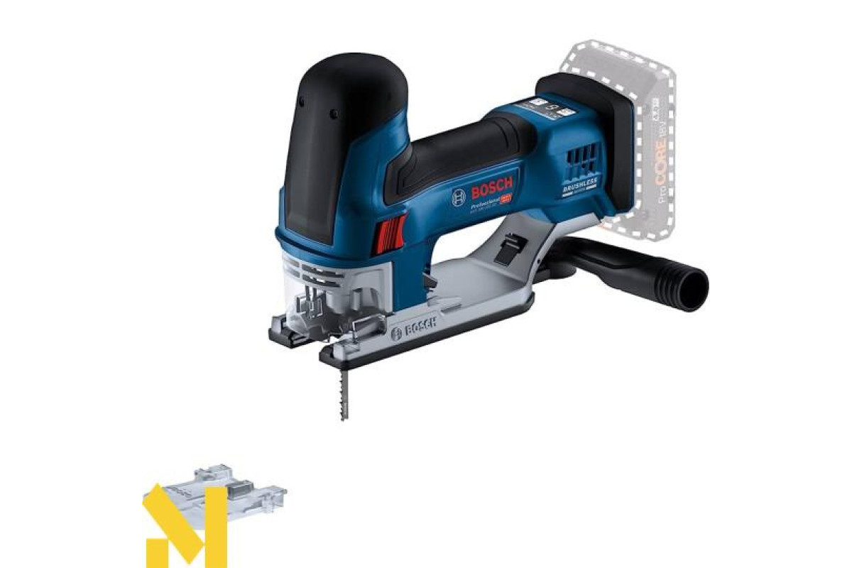 GST 18V-155 SC Professional (з рукояткою з циліндричним захопленням) оснащений безщітковим двигуном і добре збалансованою конструкцією інструмента. Ергономічна форма забезпечує обхват рукоятки 360°, а двосторонній перемикач для правшів та шульг оптимізує управління та контроль над інструментом - навіть при різанні в перевернутому положенні. Напрямна пильного полотна запобігає його вигину навіть при невеликій криволінійності та забезпечує бездоганну точність роботи. Інструмент сумісний з системою пиловідведення. Великий важіль викиду пильного полотна та функція Drop Control підвищують зручність та безпеку користувача.