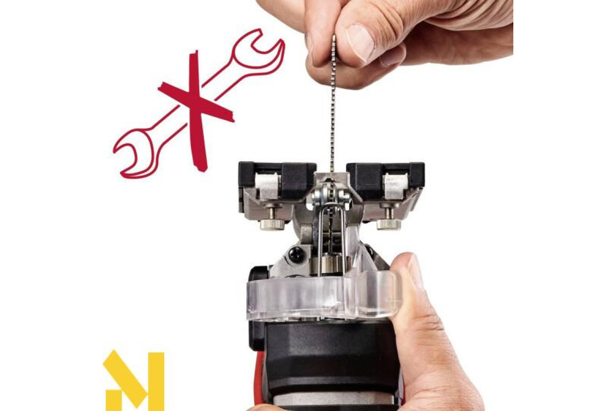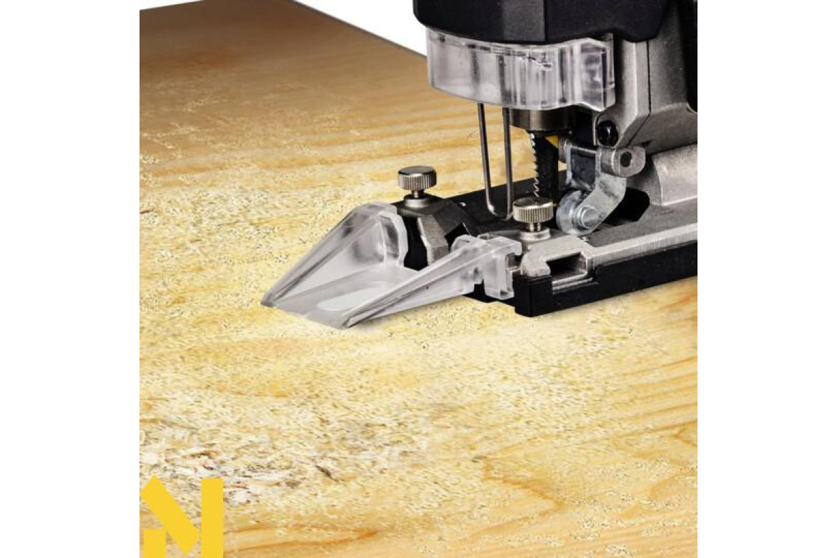 135 мм у деревині та 10 мм у сталі, а також косі різи під кутом до 45°. Він оснащений електронікою регулювання швидкості, індикатором лінії різу, тримачем пиляльного полотна без інструменту, захистом від відколів, а також системою захисту від перегріву. Поставляється з 1-м лобзиковим полотном по дереву, але без акумулятора і зарядного пристрою.