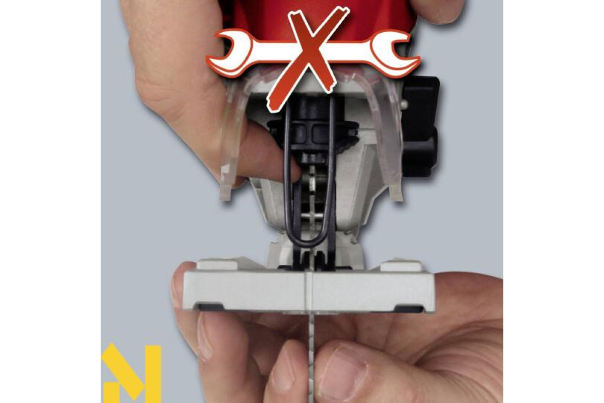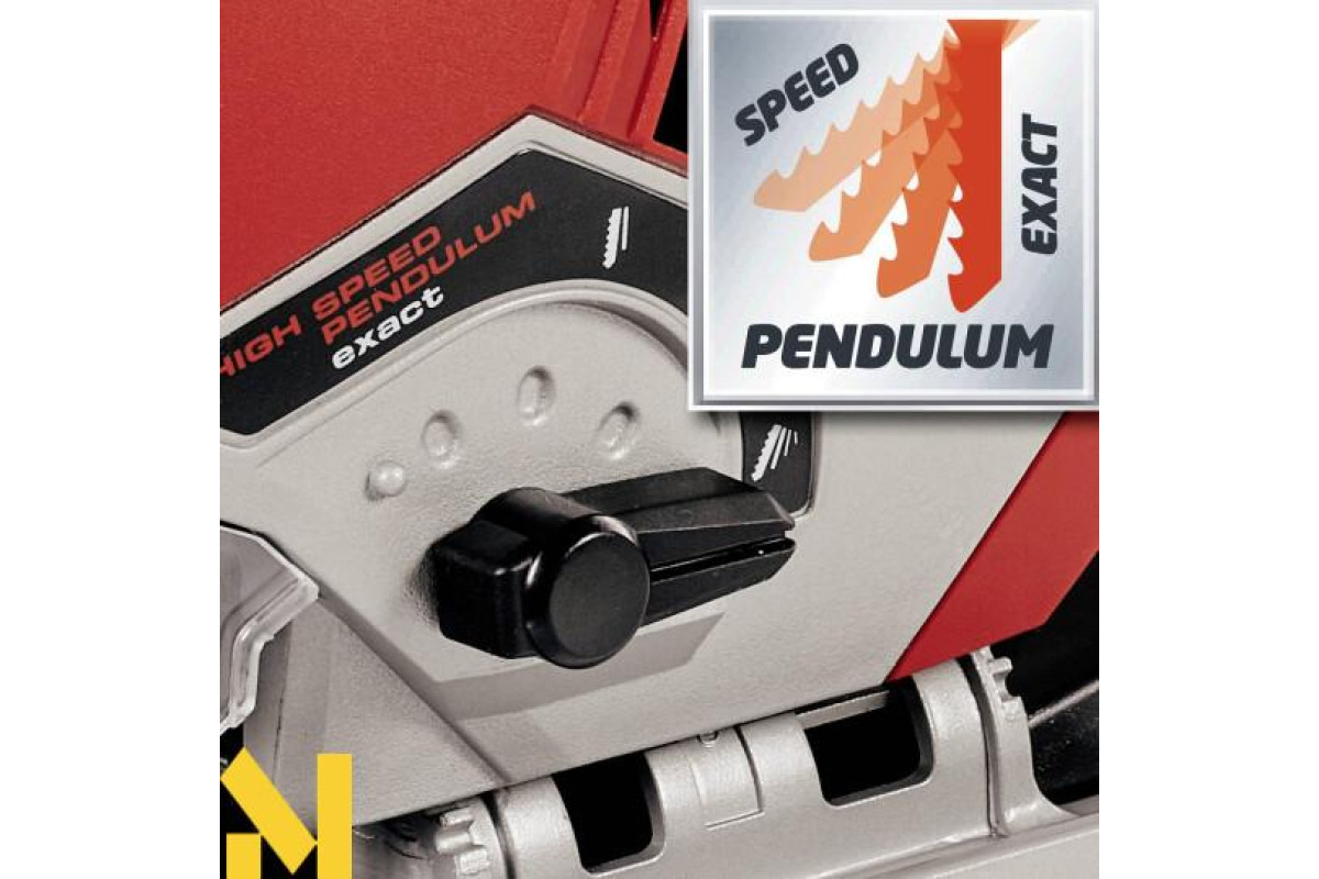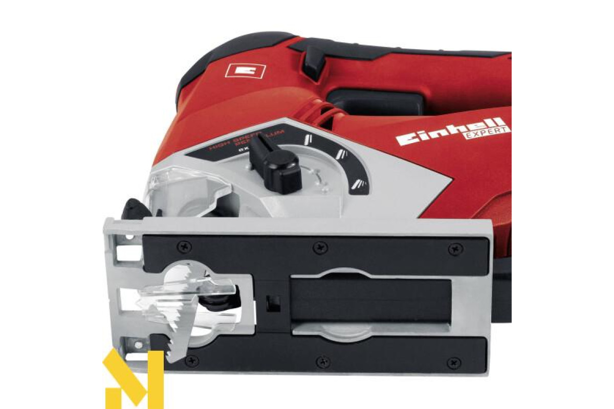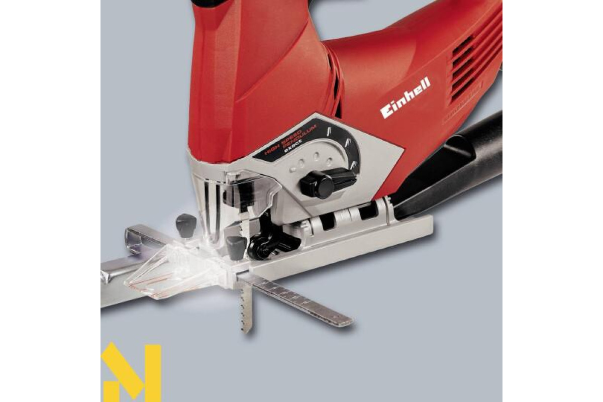 Наявність регульованою алюминевой підошви з пластиковим покриттям, електронного контролю швидкості з попереднім набором частоти обертання, маркерів із зазначенням лінії різу, режиму сдува стружки, Led підсвічування і ергономічний дизайн роблять роботу з лобзиком Einhell TE-JS 100 легкою і зручною. Заміна пильних полотен здійснюється без застосування будь-яких інструментів.