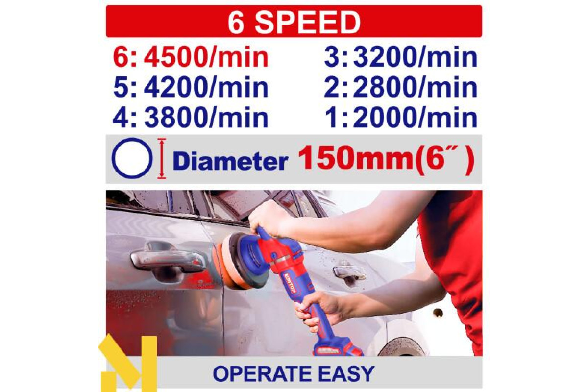 Висока потужність і ефективність: Попри акумуляторну основу, ця полірувальна машина оснащена потужним мотором, що забезпечує відмінний результат при поліруванні різних поверхонь. Вона ідеально підходить для автомобільних поверхонь, меблів, металу та інших матеріалів, що вимагають високоякісного фінішного оброблення.