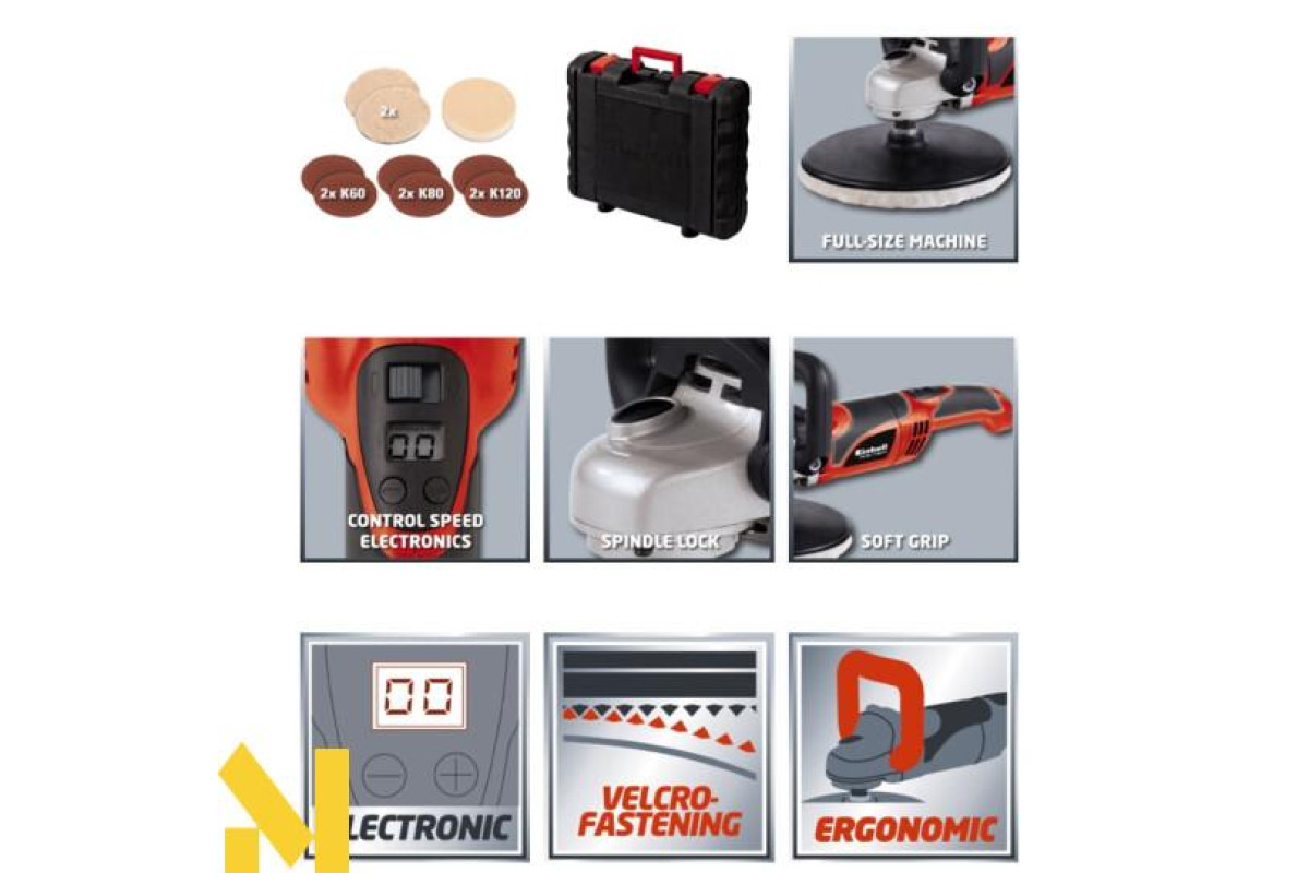 Зі зручною, потужною і надійною полировально-шліфувальною машиною Einhell CC-PO 1100/150 E, амбітні ентузіасти, які звикли робити все своїми руками, отримують зручний, потужний інструмент для полірування лакованих поверхонь машини, для шліфування дерев'яних, пластикових і металевих поверхонь. За допомогою електронного контролю швидкості потужність полірування або шліфування може бути скоригована в залежності від матеріалу. Додаткова рукоятка робить легкою і зручною роботу з полировально-шліфувальною машиною Einhell CC-PO 1100/150 E.