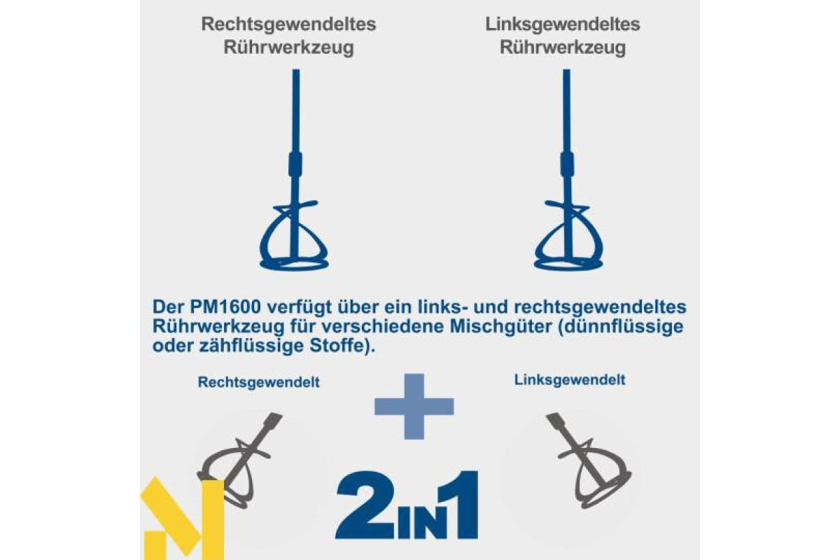 Ручний міксер PM1600 постачається з другим спіральним змішувачем розчину діаметром 140 мм. Це дозволяє легко перемикатися між двома різними процесами змішування без попереднього очищення змішувального стрижня.