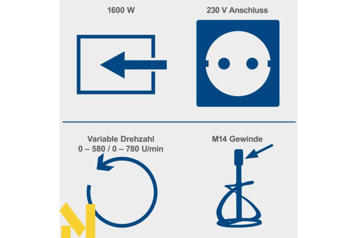 Міксер scheppach PM1600 оснащений потужним двигуном потужністю 1600 Вт, що забезпечує достатню потужність для широкого спектру процесів змішування фарби, розчину та інших порошкоподібних матеріалів. Завдяки регульованій швидкості швидкість змішування можна оптимально налаштувати відповідно до відповідної речовини. Двошвидкісна коробка передач забезпечує постійний достатній крутний момент для всіх матеріалів, що змішуються.