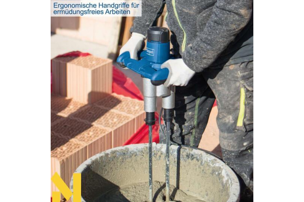 Подвійна мішалка PM1800D від Scheppach перемішує одночасно з двома мішалками, що обертаються в протилежних напрямках. Результатом є оптимально однорідна суміш, яку цінують як на будівельних майданчиках, так і любителі самостійного ремонту. Рідкі та порошкоподібні будівельні матеріали, такі як фарби, розчини, клеї, штукатурки та подібні речовини, можна швидко та легко змішувати.