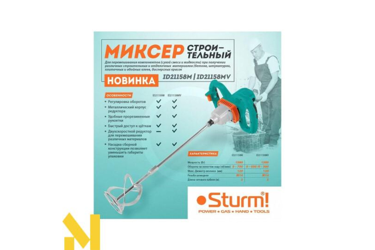 Будівельний міксер Sturm ID21158M представляє собою універсальний ручний електричний інструмент, призначений для перемішування різноманітних будівельних сумішей. Компактність, ергономічний дизайн, обгумовані рукоятки, можливість самостійно змінювати вугільні щітки, все це - зручність, комфорт і безпеку під час експлуатації, обслуговування та зберігання виробу. Високий крутний момент дозволяє швидко і, що найголовніше, якісно перемішувати в'язку фарбу, лак, а також різні будівельні розчини. Надійний потужний електродвигун (+1580 Вт) і можливість плавно регулювати швидкість обертання шпинделя від 0-700 об / хв роблять виріб Sturm універсальним і оптимальним інструментом при проведенні ремонтних і будівельних робіт. У комплект поставки будівельного міксера входить насадка Ø120 мм М14.