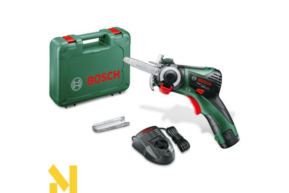 Легка (0,9 кг) ручна пила Bosch EasyCut 12, що працює від Li-Ion 12 В або 10,8 В акумулятора і знадобиться для обрізки гілок, розпилювання невеликих деталей з деревини (глибина різу 65 мм) і пластмаси (30 мм).
