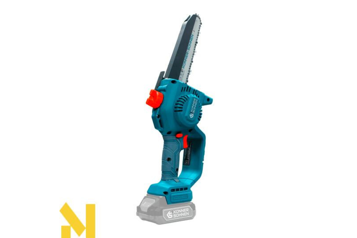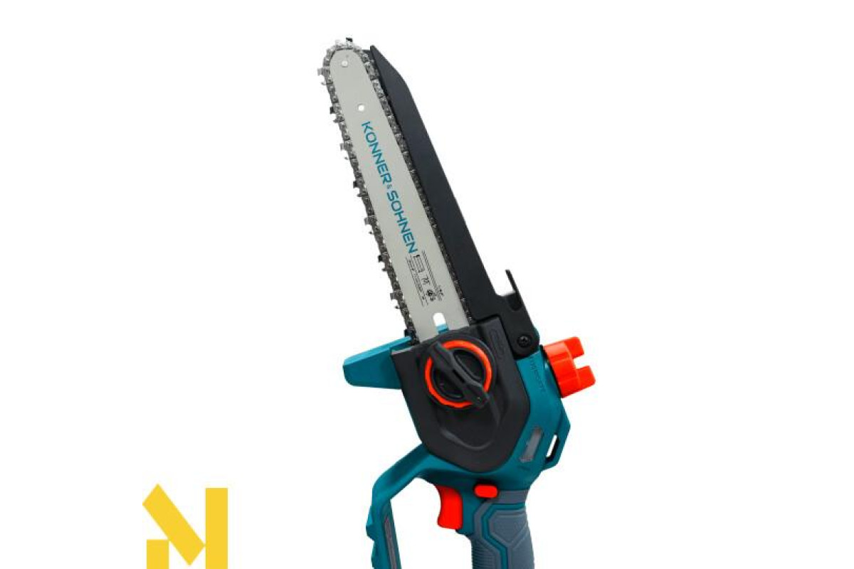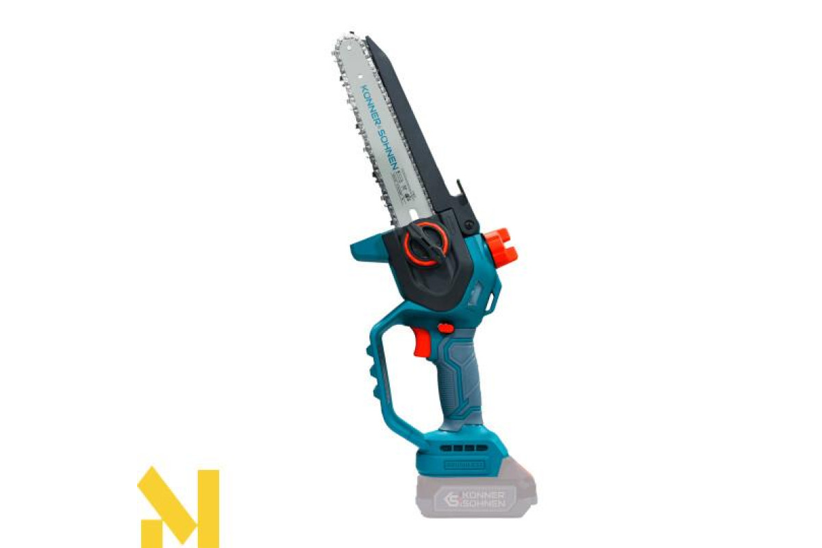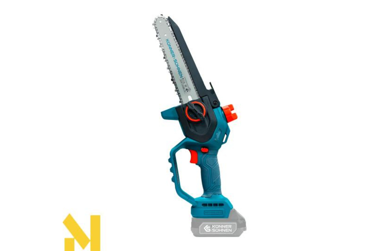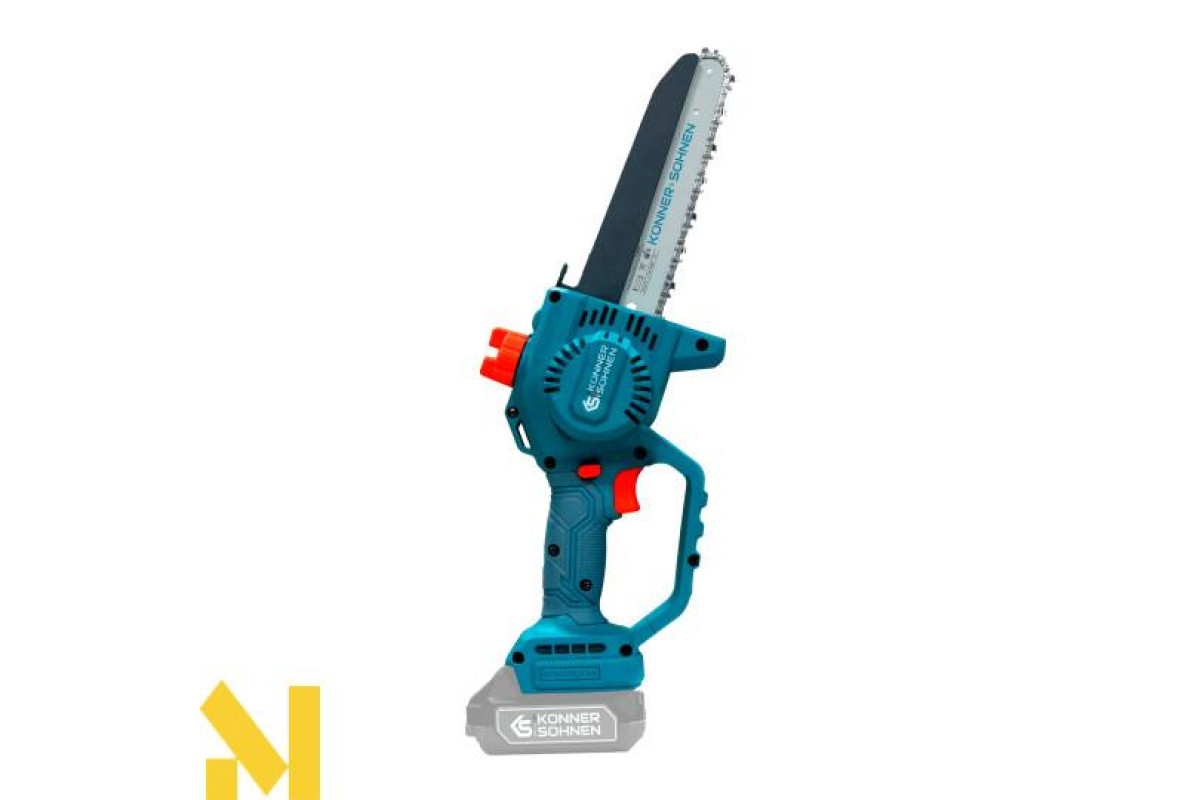 Акумуляторна мініпила KS MCS20V-8 торгової марки Könner & Söhnen з шиною і швидкістю ланцюга — надійний інструмент для роботи в саду. Потужний безщітковий двигун працює тихо, довговічно та стабільно. Компактний корпус і ергономічна гумова рукоятка забезпечують зручність і контроль навіть однією рукою. Для безпеки передбачені запобіжник, захисні кожухи й щиток, а для зручності — швидкий натяг ланцюга без інструментів, автоматичне змащення ланцюга та віконце для контролю рівня масла: