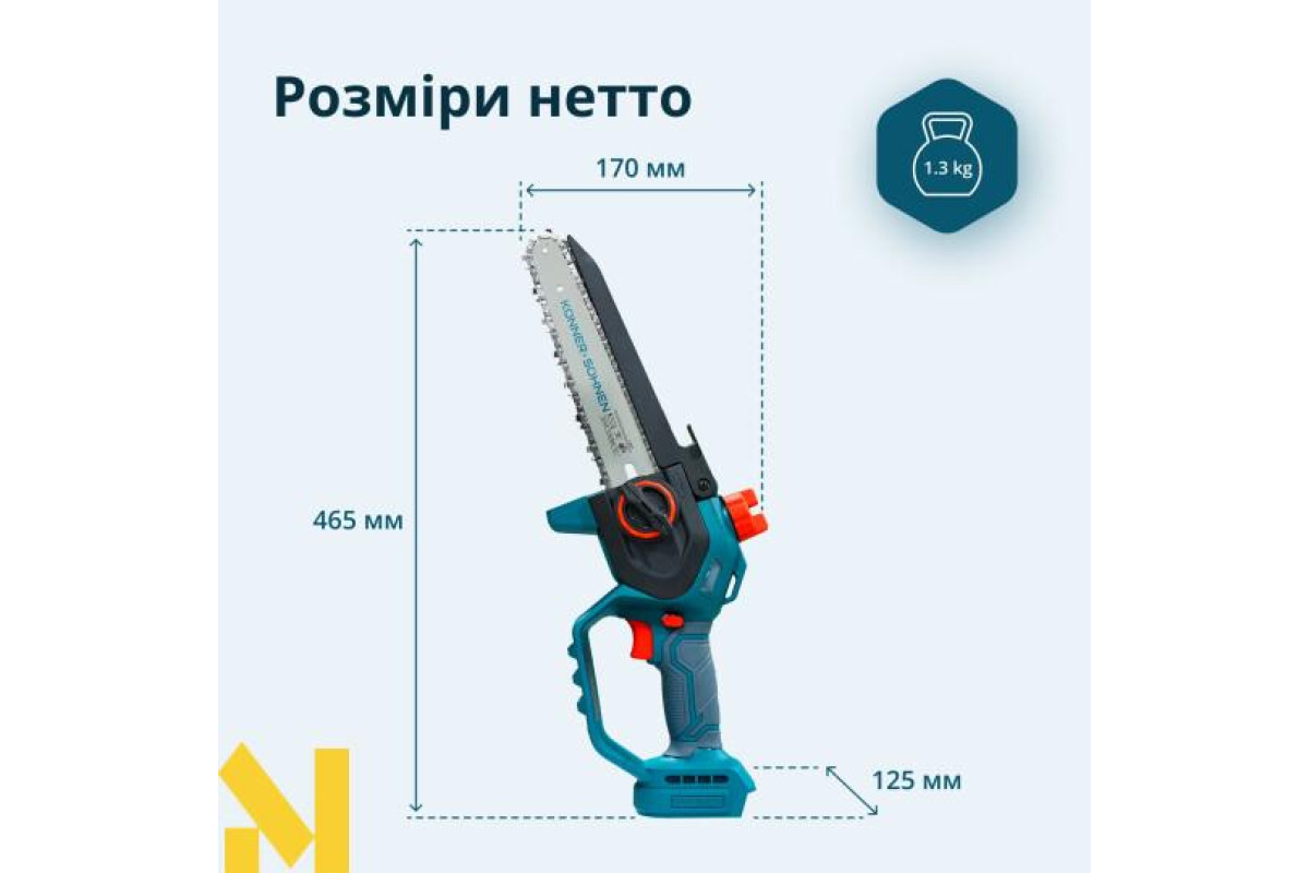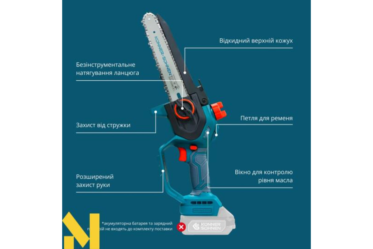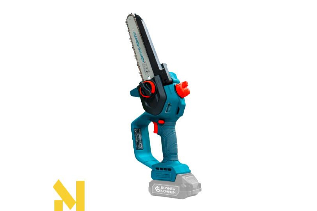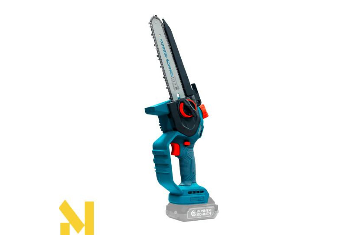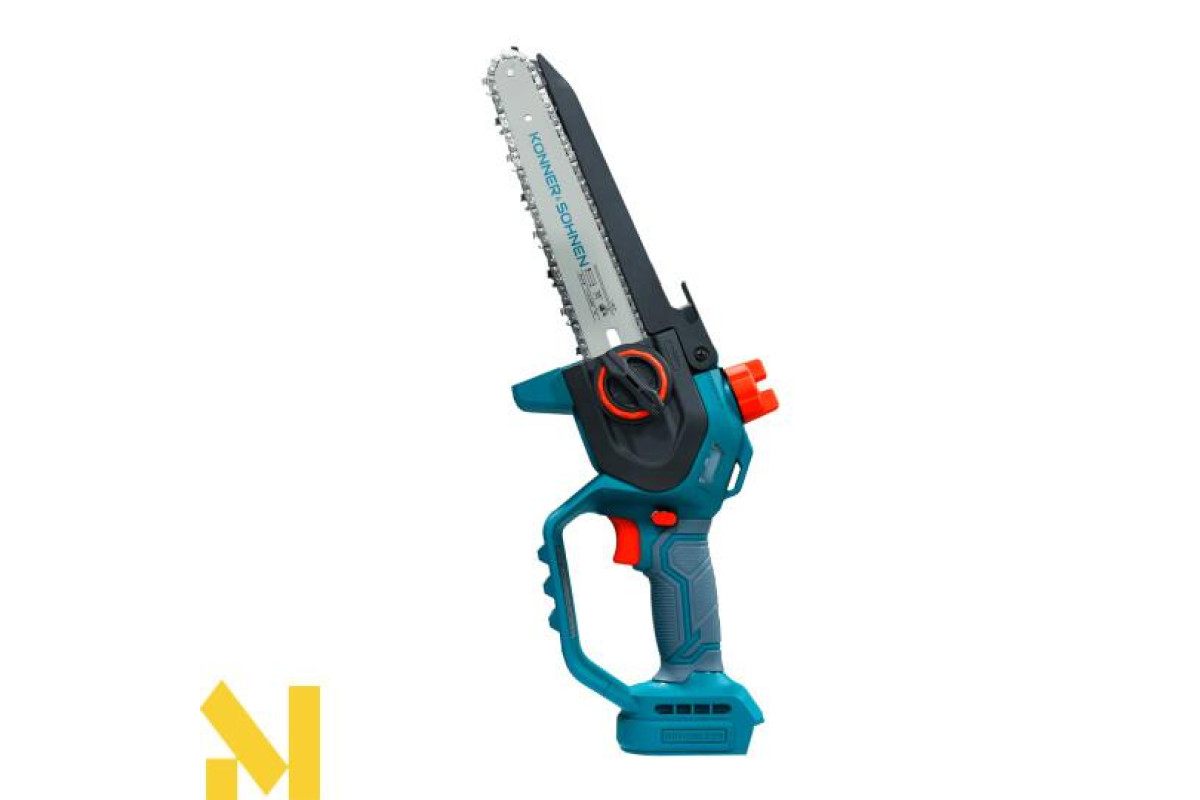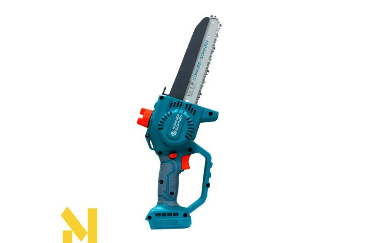 Акумуляторна мініпила KS MCS20V-8 торгової марки Könner & Söhnen з шиною і швидкістю ланцюга — надійний інструмент для роботи в саду. Потужний безщітковий двигун працює тихо, довговічно та стабільно. Компактний корпус і ергономічна гумова рукоятка забезпечують зручність і контроль навіть однією рукою. Для безпеки передбачені запобіжник, захисні кожухи й щиток, а для зручності — швидкий натяг ланцюга без інструментів, автоматичне змащення ланцюга та віконце для контролю рівня масла: