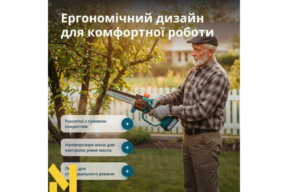 Довжина шини та швидкість ланцюгадозволяє легко зрізати гілки діаметром до 100мм, ідеально підходить для обрізки дерев та столярних робіт.