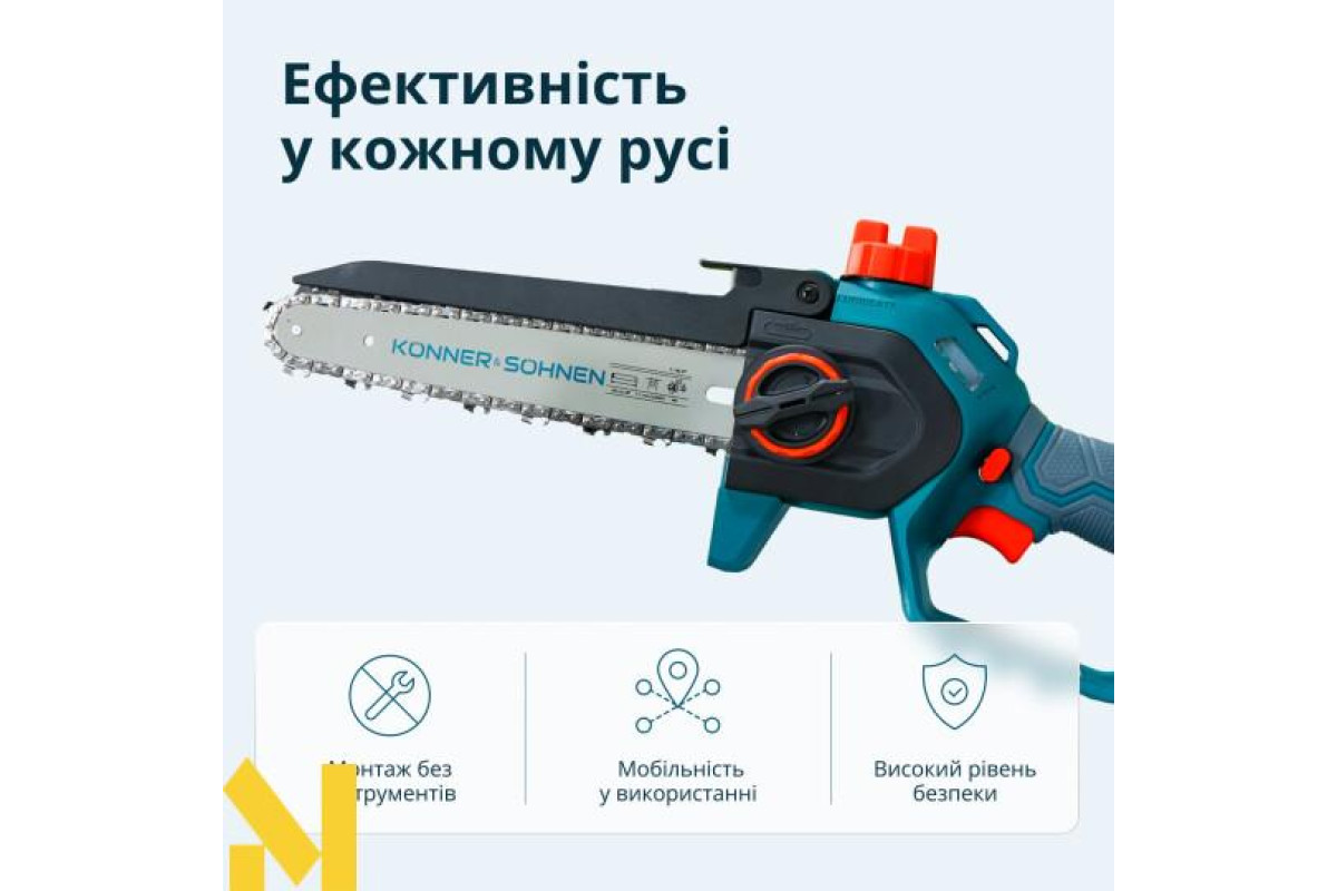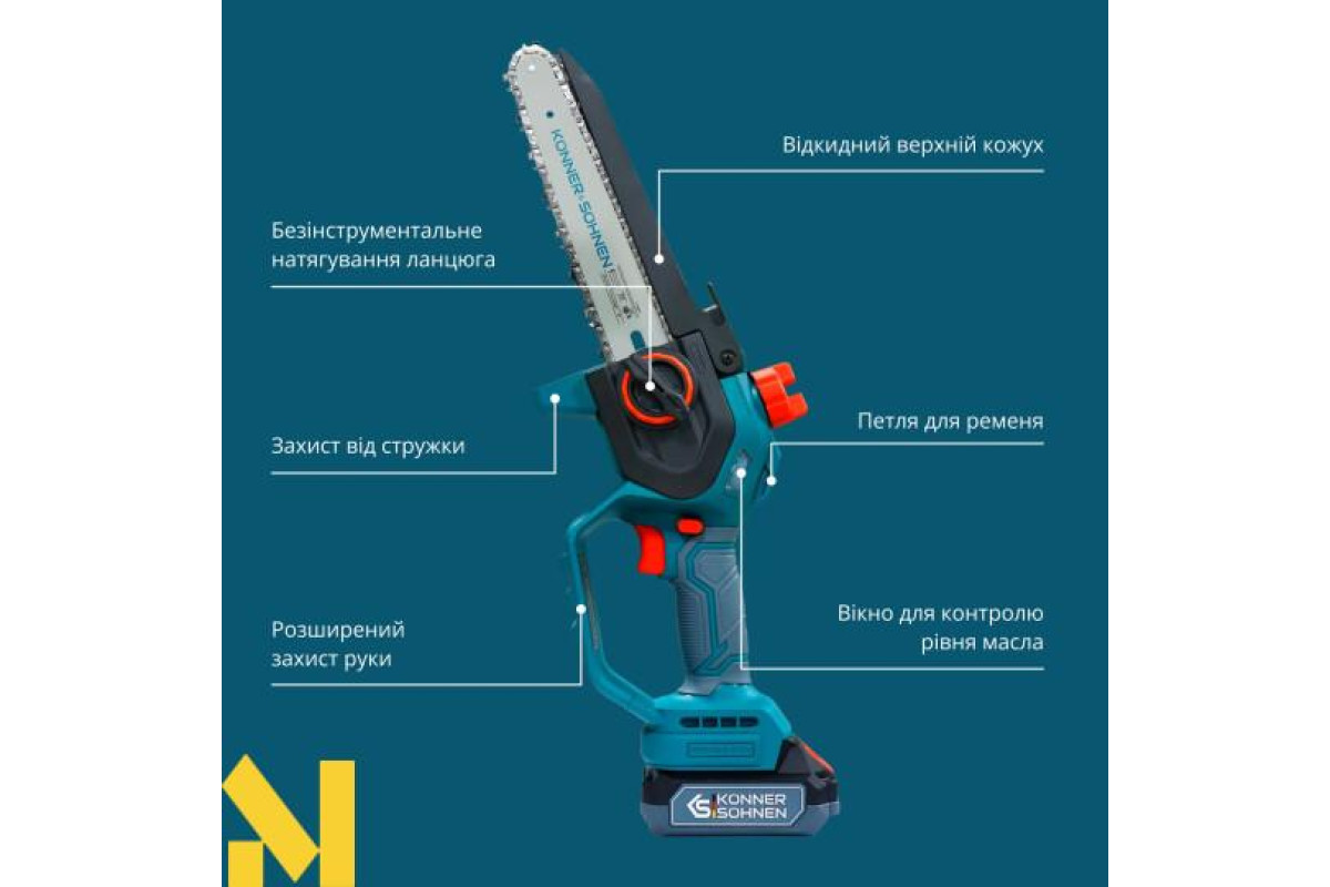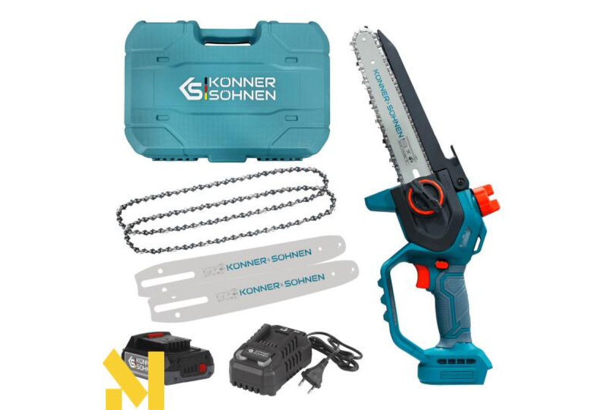 Акумуляторна мініпила KS MCS20V-8 Case від німецької марки Könner & Söhnen з шиною та швидкістю ланцюга — потужний і тихий інструмент для саду. Безщітковий двигун забезпечує надійну роботу. Пила працює від акумулятора, що разом з зарядним пристроєм та 2 шинами і 2 ланцюгами. Ергономічна рукоятка, захисний щиток, кнопка-запобіжник і верхній кожух гарантують безпеку. Механізм швидкого натягу ланцюга та автоматичне змащення спрощують обслуговування. Петля для страхувального ременя дозволяє працювати на висоті. Ідеальна для обрізки гілок та догляду за деревами.