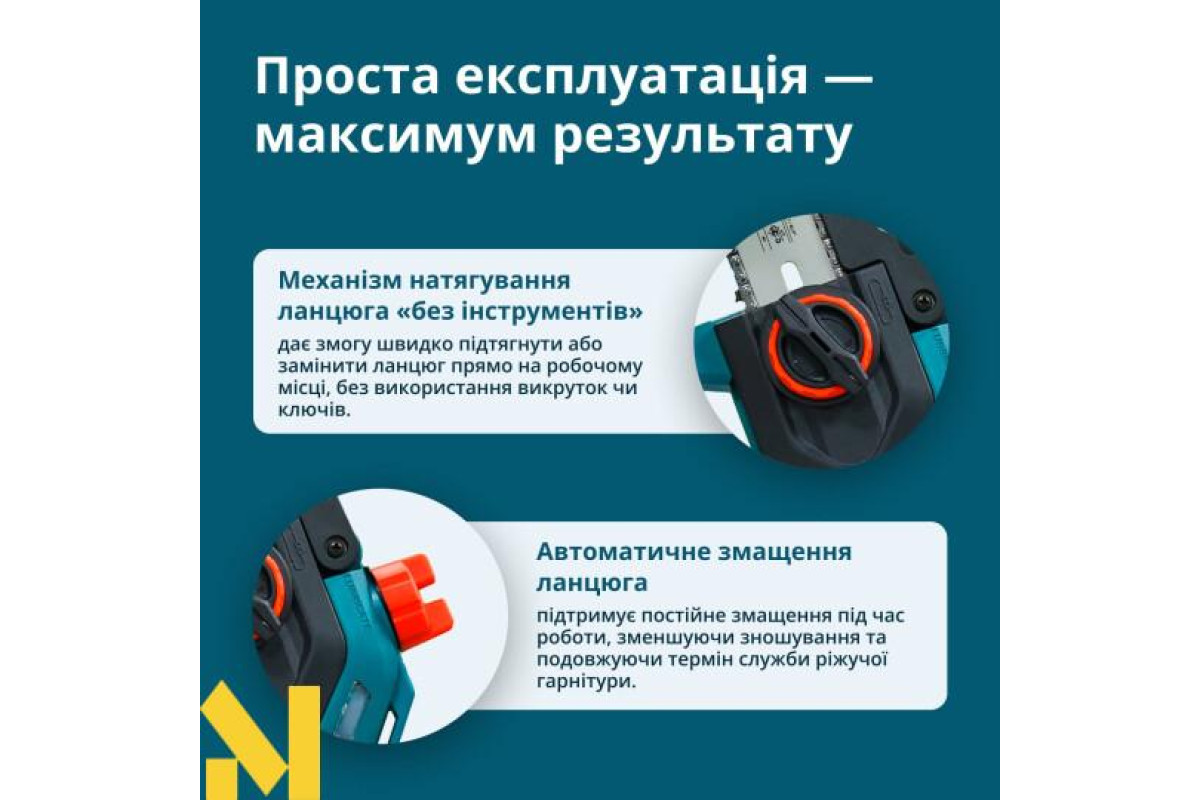 Механізм натягування ланцюга «без інструментів» дає змогу швидко підтягнути або замінити ланцюг прямо на робочому місці, без використання викруток чи ключів.
