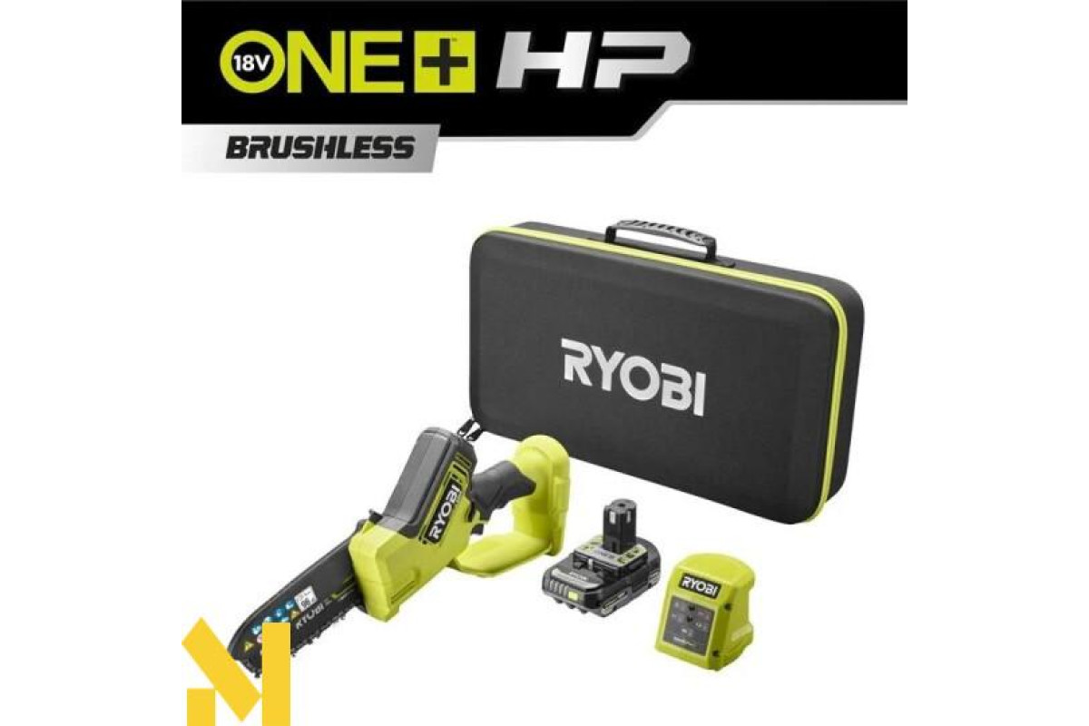 Пила ланцюгова акумуляторна Ryobi RY18PSX15A-120T (код товару: 5133005899) серії ONE+ HP (High Performance) з потужним безщітковим двигуном, що забезпечує високу якість роботи, більш тривалий час роботи та більш тривалий термін служби. Акумуляторна безщіткова пила RYOBI довжиною шини 15 см ідеально підходить для обрізання гілок, сучків та подрібнення садового сміття.