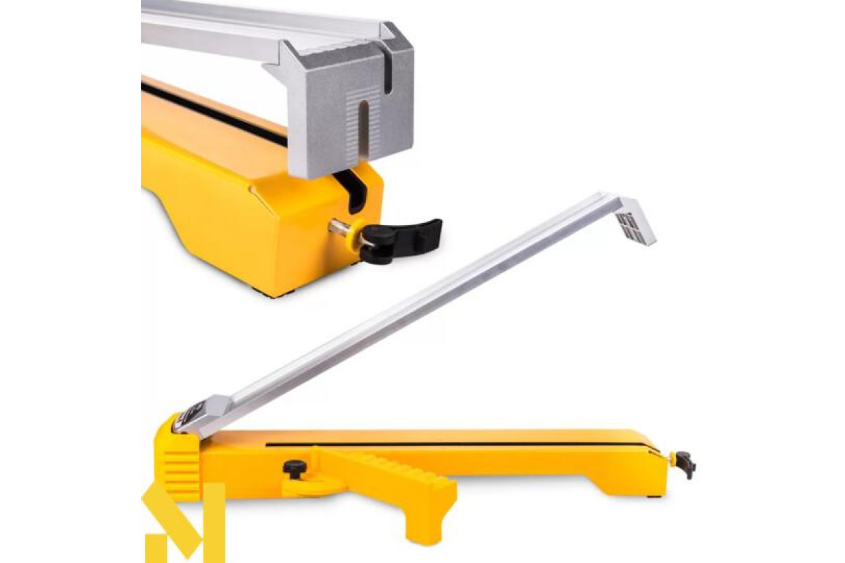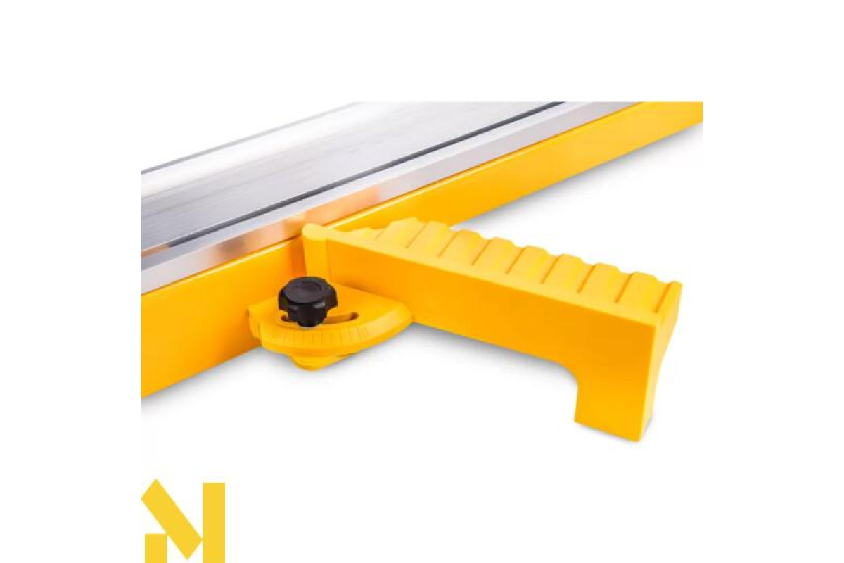Для зручного та точного розпилювання матеріалу до прецизійної пилки додається напрямна шина. У ній використовується комбінація сталевої конструкції та алюмінієвої направляючої, що робить її жорсткою та міцною. Знімний подовжувач дає змогу різати матеріал під кутом від 45° до 90°. Верхня алюмінієва частина направляючої легко запобігає зсуву матеріалу. Шарнір встановлений на міцній пружині, тому він ідеально адаптується до товщини матеріалу, що встановлюється в даний момент, і фіксується швидкознімним затискачем.