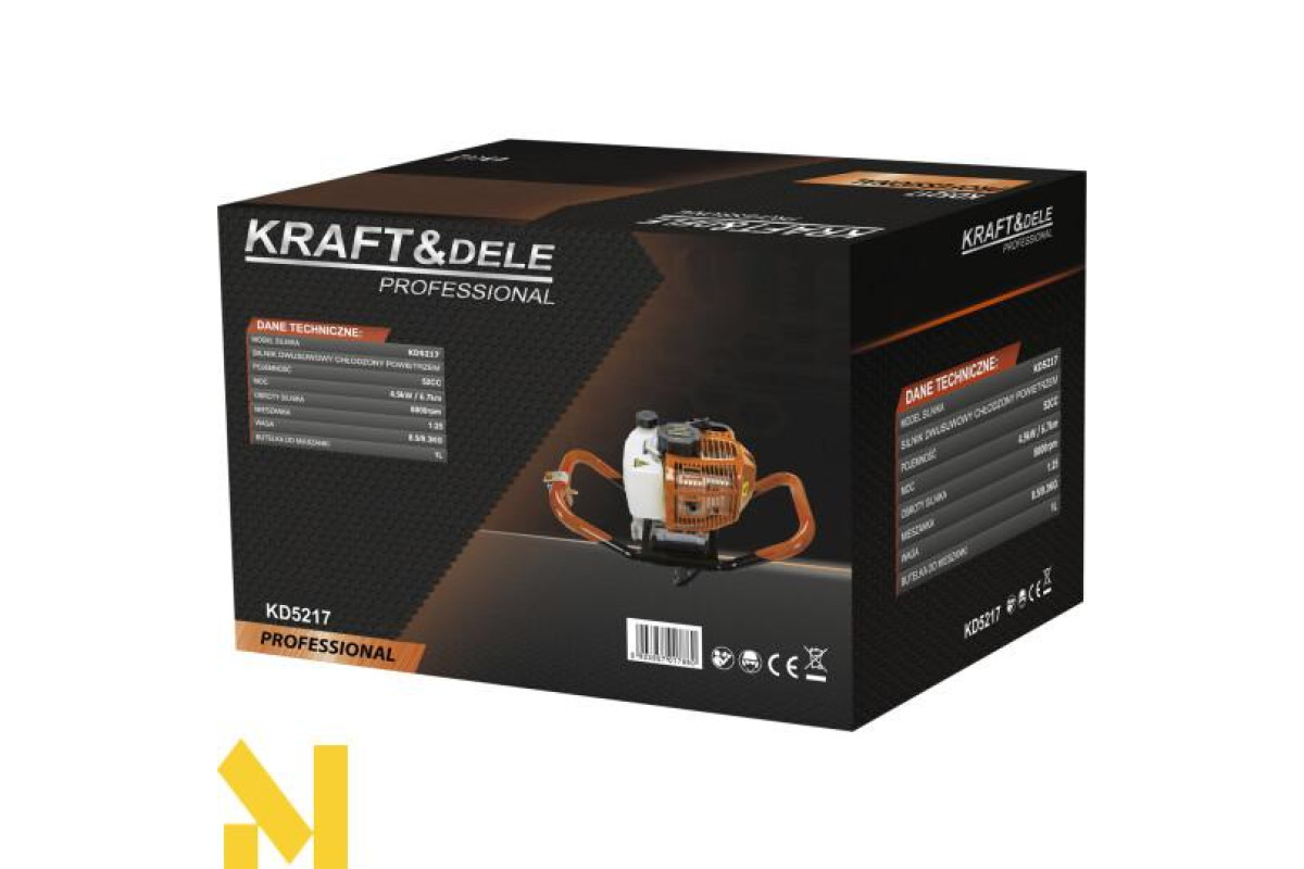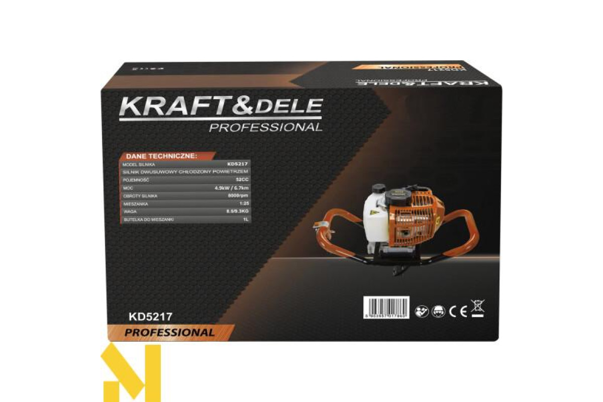 KD5217 — це потужна та надійна бензинова бурова установка марки KRAFT&DELE, призначена для буріння отворів у землі під стовпи, огорожі, точкові фундаменти або насадження. Завдяки двигуну потужністю і високій максимальній частоті обертання вона впорається навіть з найважчим рельєфом, незалежно від ситуації та умов роботи. Потужний двотактний двигун забезпечує високу ефективність роботи навіть у складних умовах місцевості. Наше обладнання базується на перевіреній конструкції, яка в поєднанні з матеріалами найвищої якості робить буріння отворів швидким і безпроблемним.