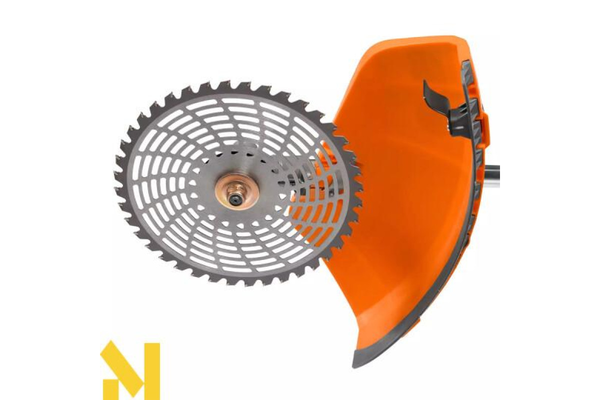Він виготовлений з високоміцної сталі та оснащений 40 твердосплавними зубами. Підходить для скошування жорсткої трави, кущів і тонких стовбурів дерев.