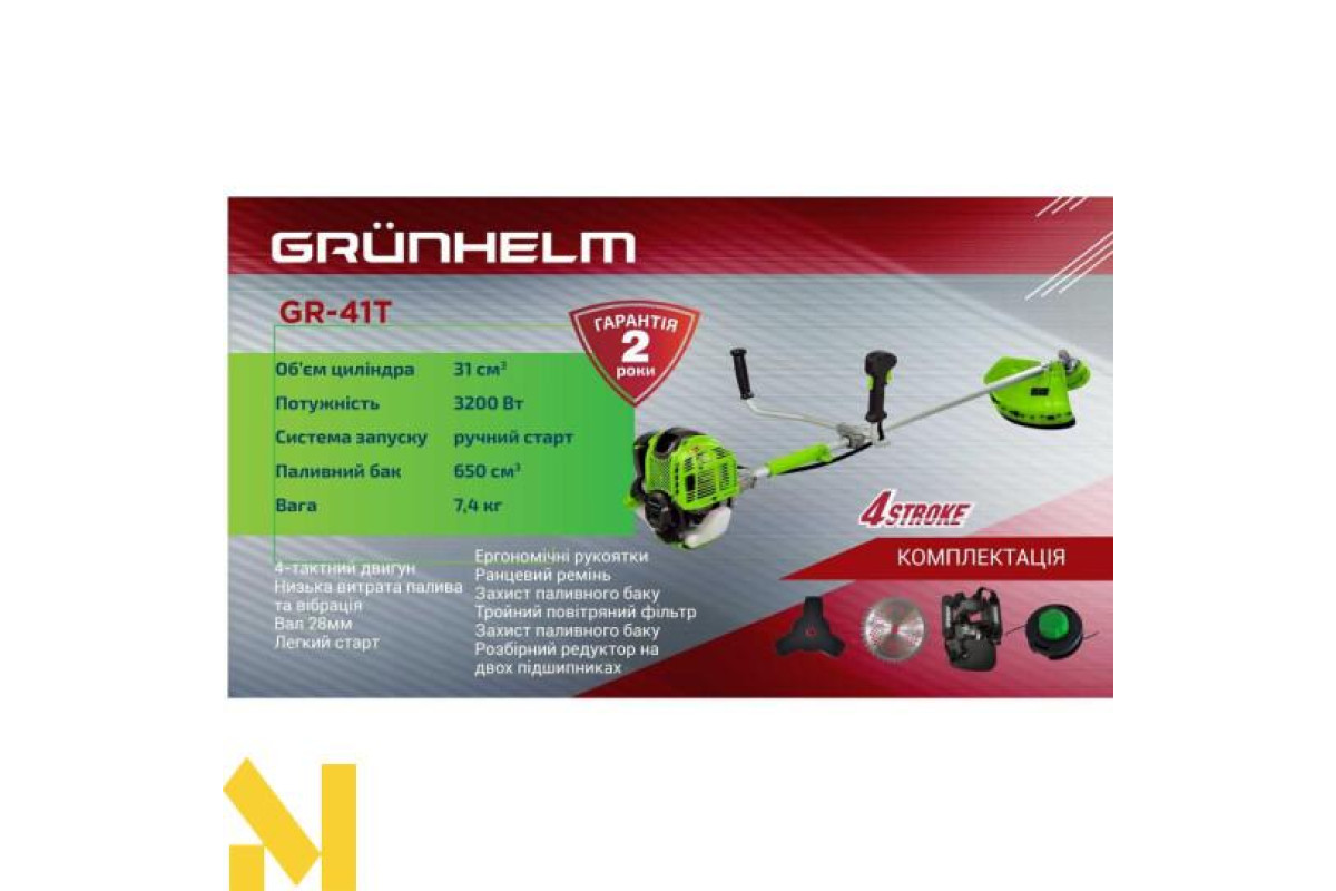 Бензинова мотокоса Grunhelm GR-41T- хороший недорогий варіант надійної мотокоси, що прослужить вам не один рік. Таку модель часто використовують для прибирання присадибних ділянок великих обсягів: заготівля сіна, боротьба з бур'янами, косіння великих територій.