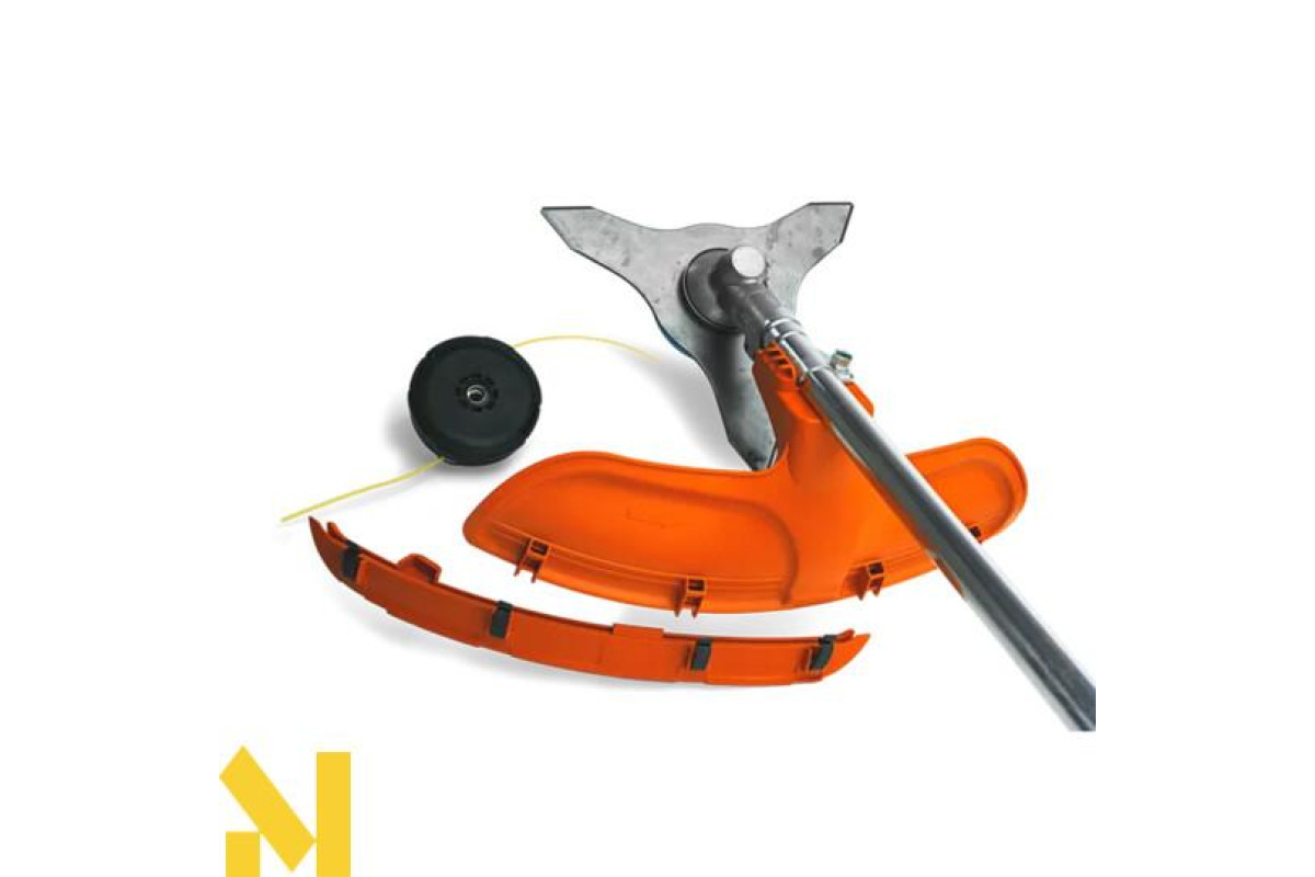 Комбінований захисний кожух може використовуватись як з тримерною головкою, так і з ножем для трави.