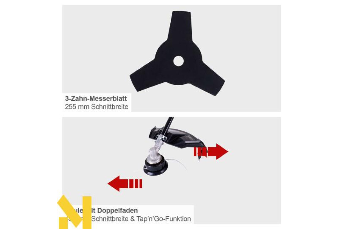 3-зубе лезо, котушка з волосінню та дві запасні котушки в комплекті