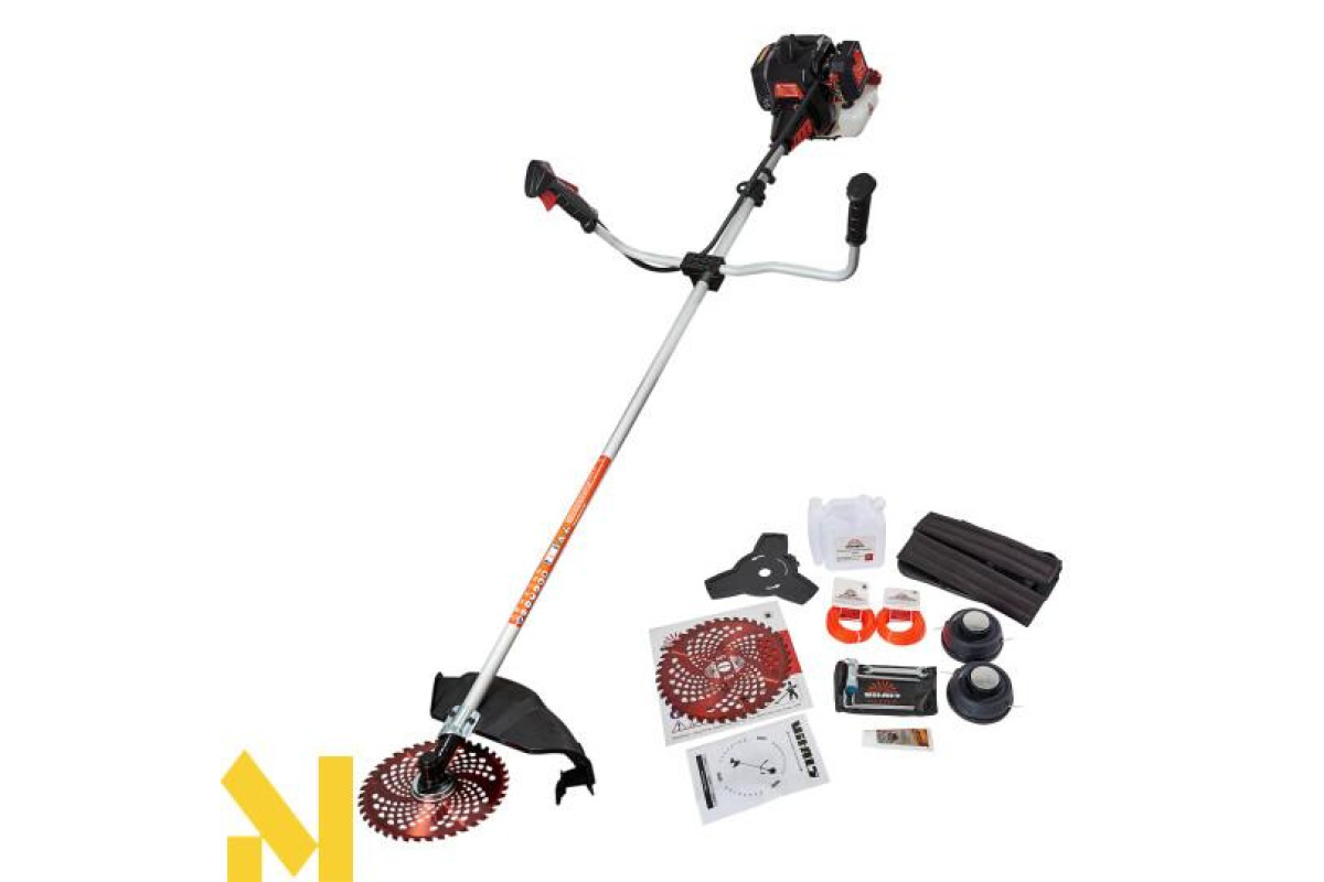 Об'єм двигуна 33 куб.см. забезпечує компактні розміри і малу вагу мотокоси, а також її високу економічність.