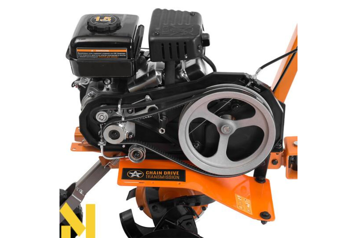 Кращим конструктивним рішенням даного пристрою можна назвати розбірну ланцюгову трансмісію, яка передає до 100% крутного моменту двигуна на фрези. Надійність конструкції і простота обслуговування - основні переваги цієї системи приводу фрез культиватора. Місце постійного контакту з землею додатково посилено сталевою пластиною.