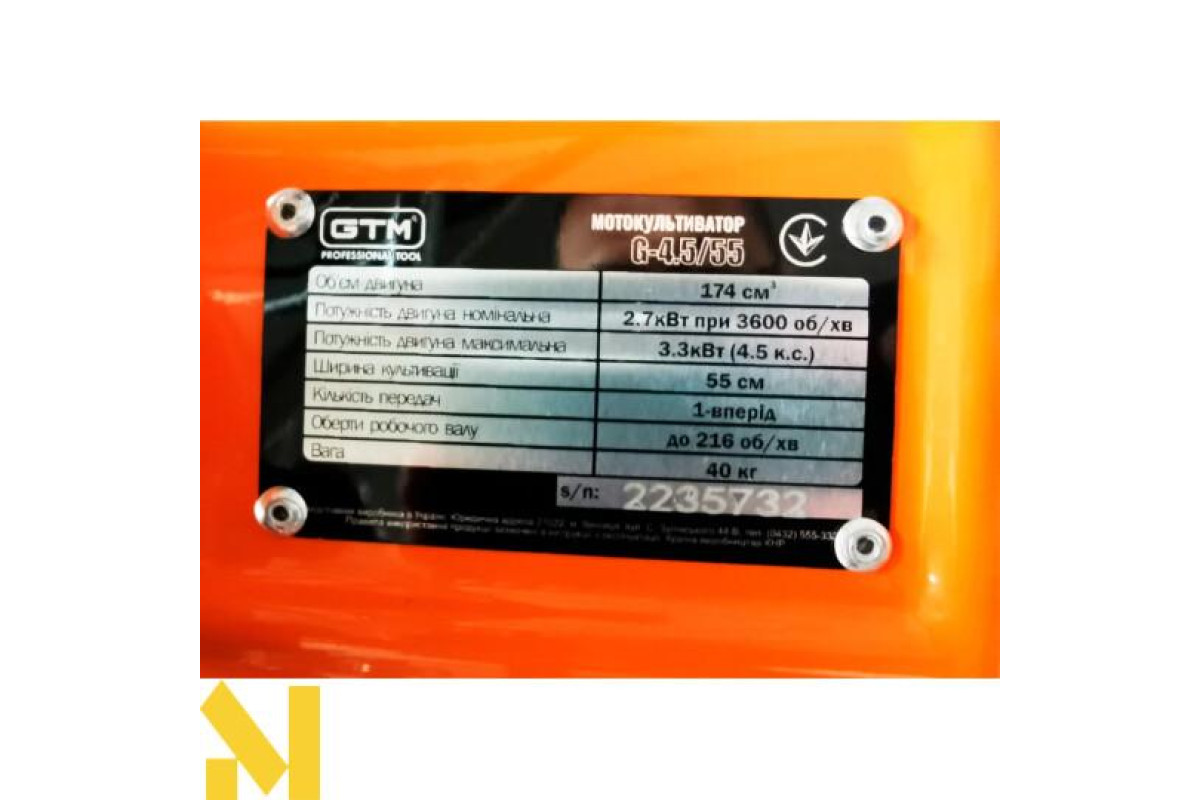 GTM G-4,5/55 - садова техніка побутового класу для обробки землі, оранки грядок і городів невеликої площі. Цю модель культиватора оснащено бензиновим двигуном з потужністю 4,5 к.с (3.31 кВт) зі збільшеним крутним моментом для кращої роботи. Ширину культивації під час роботи можна регулювати від 350 мм до 550 мм, залежно від ширини грядки.