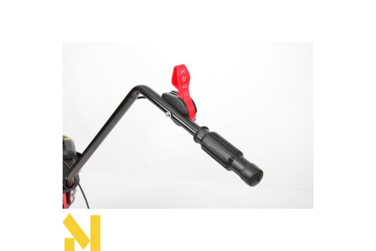 Рукоятка забезпечена важелем, який приводить у дію механізм приводу ножа, і важелем для регулювання обертів двигуна.