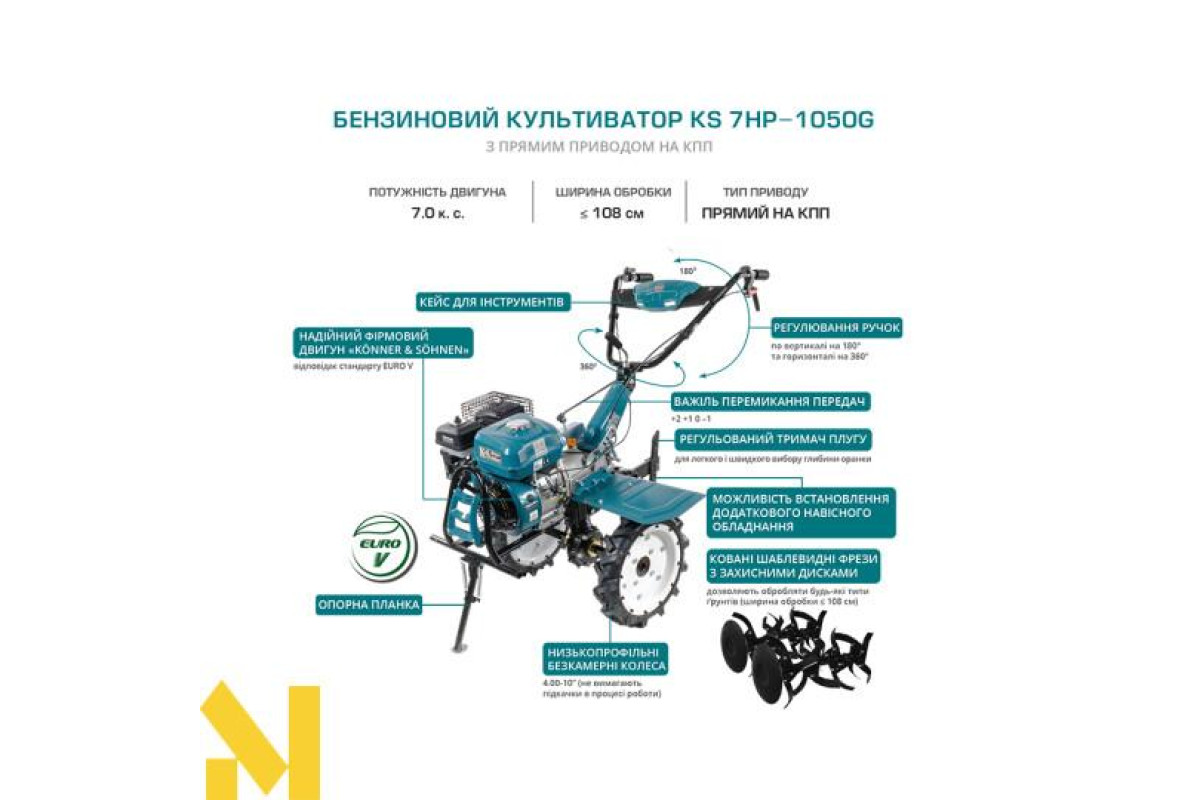 Культиватор KS 7HP-1050G володіє достатньою потужністю для обробки великих городів і здатний працювати з усім необхідним навісним обладнанням для якісного догляду за участко