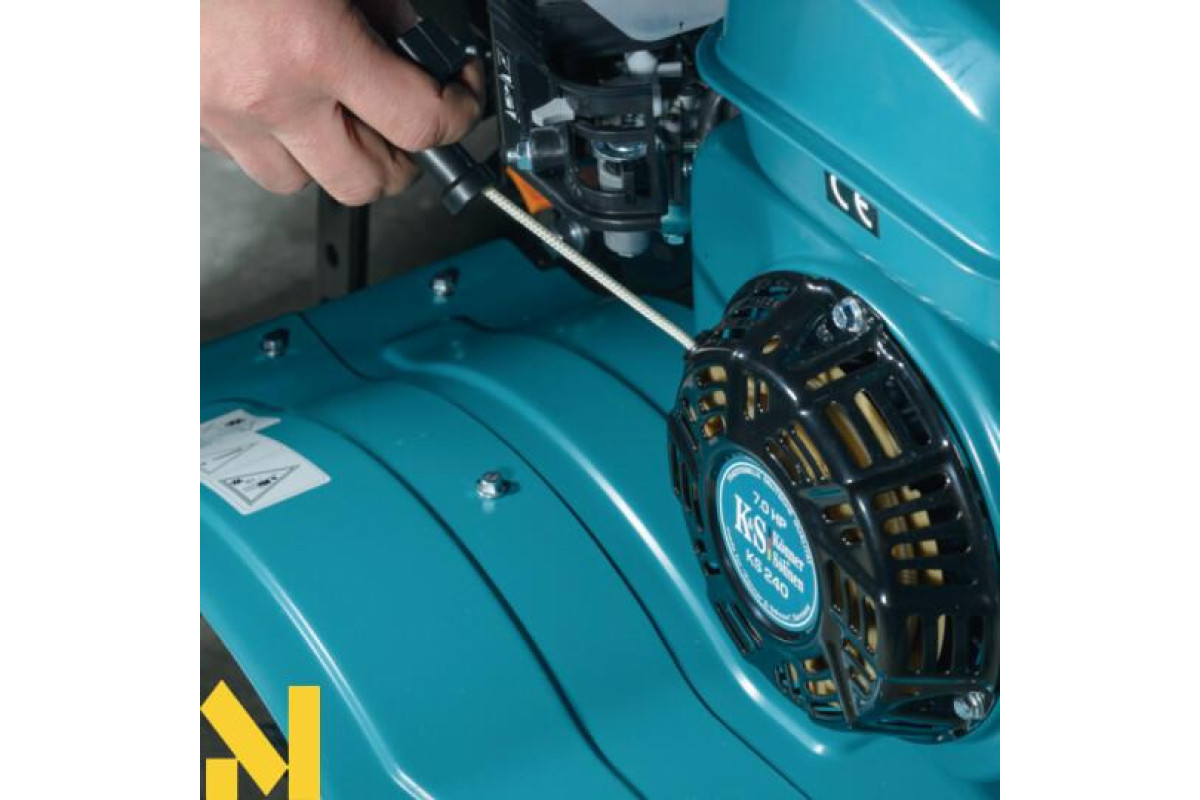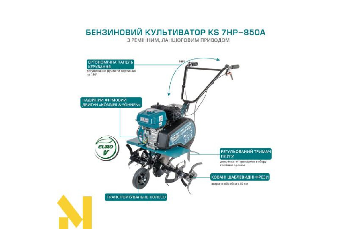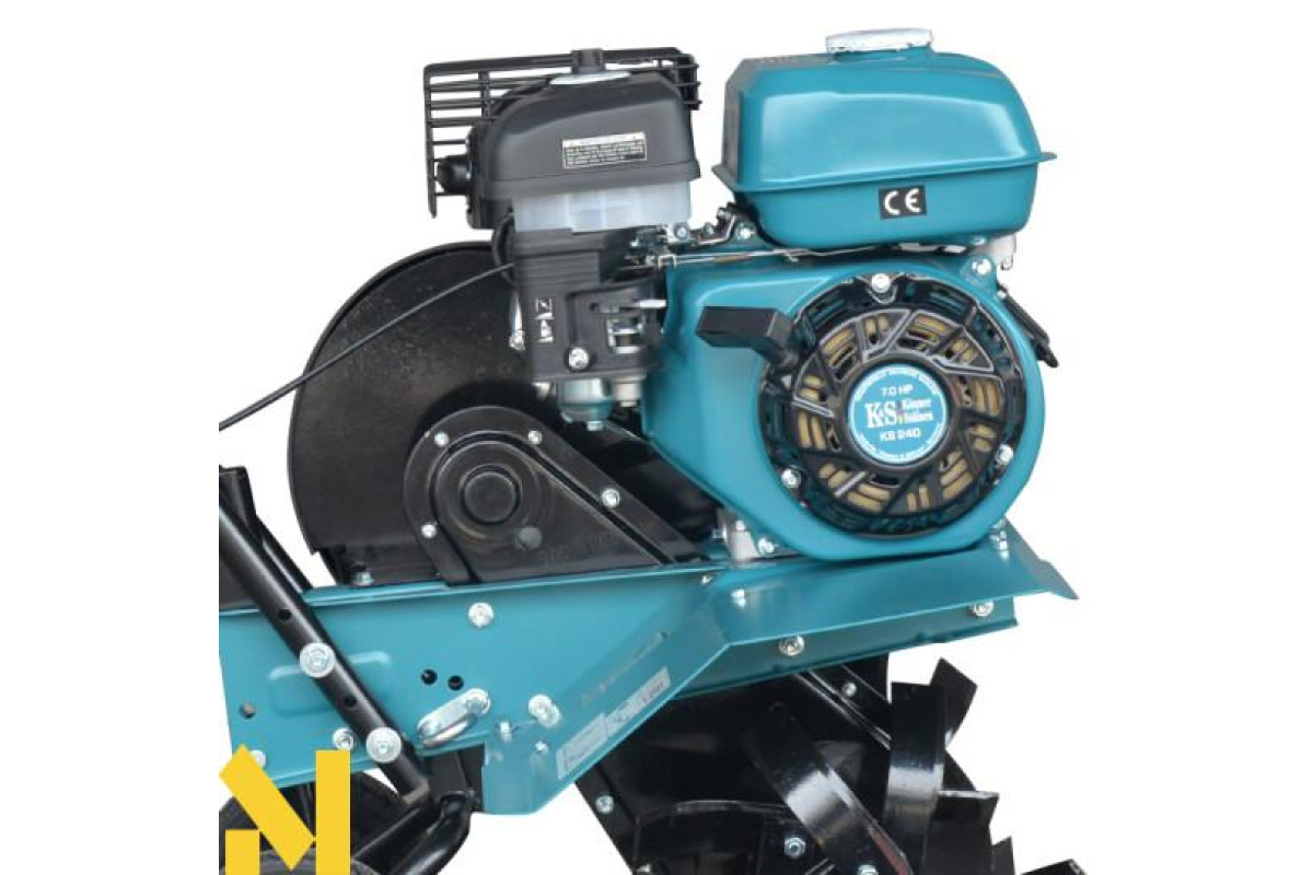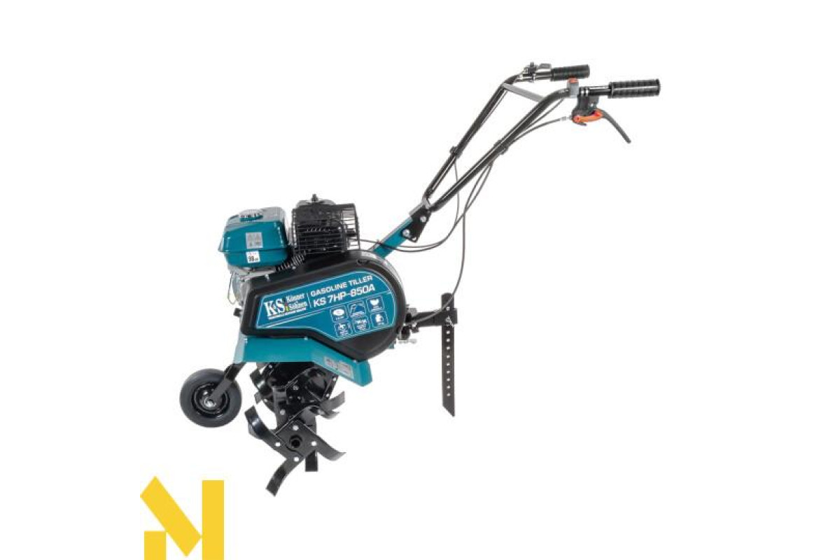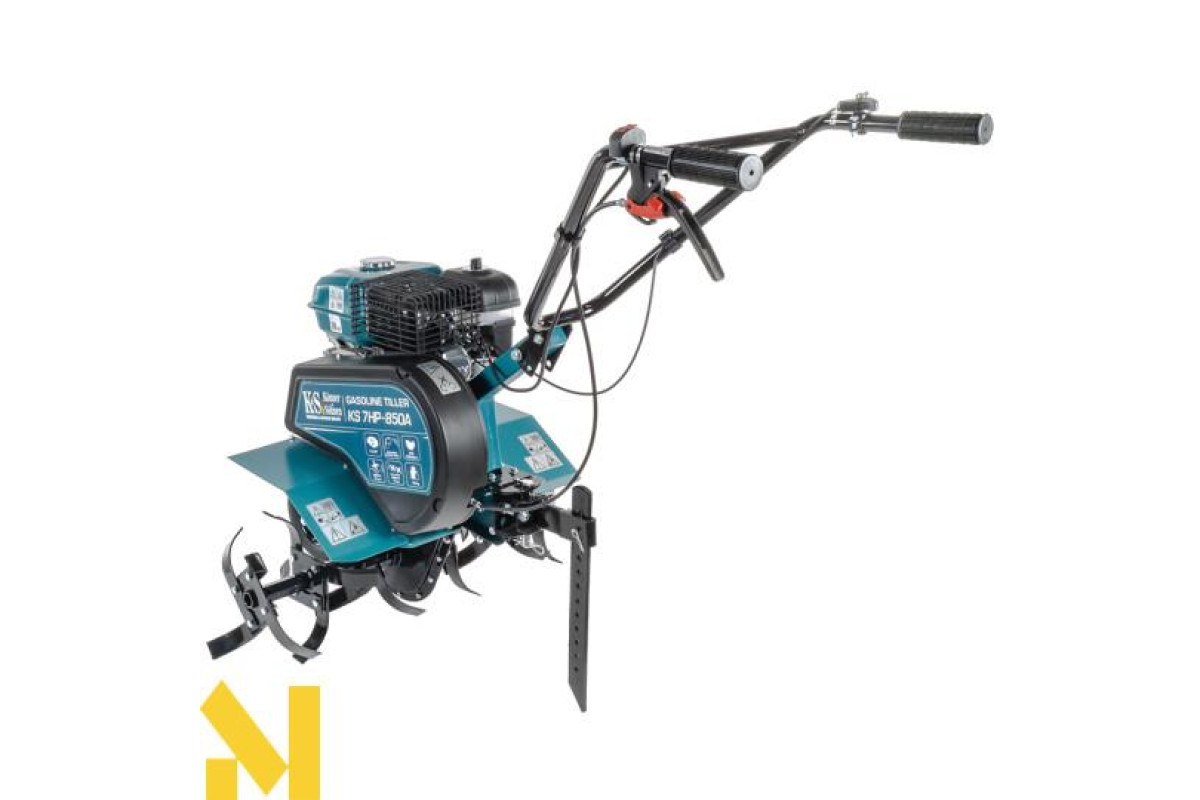 Модель культиватору KS 7HP-850A компактних розмірів, має транспортувальне колесо, яке дозволяє легко маневрувати навіть на малих земельних ділянках. Культиватор передбачає установку додаткового навісного обладнання (наприклад, плуг-підгортальник, плуг для оранки, картоплекопач).