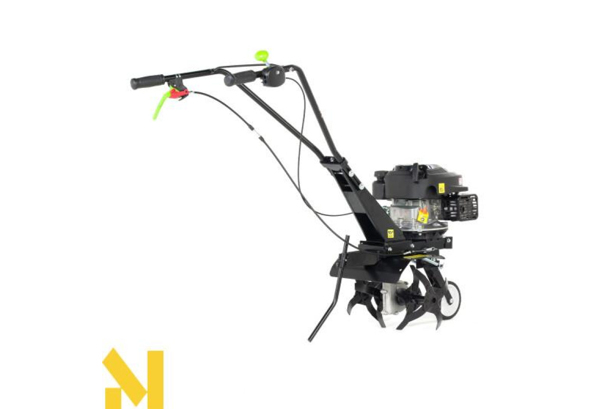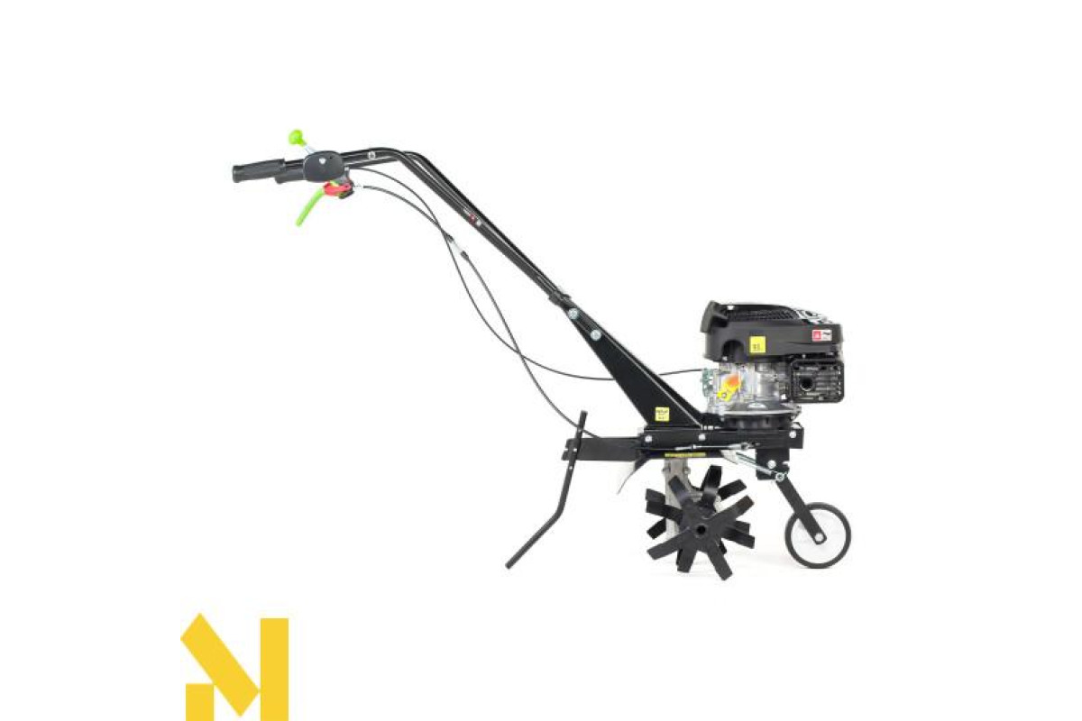 Культиватор оснащений транспортним колесом, що полегшує роботу та переміщення пристрою.