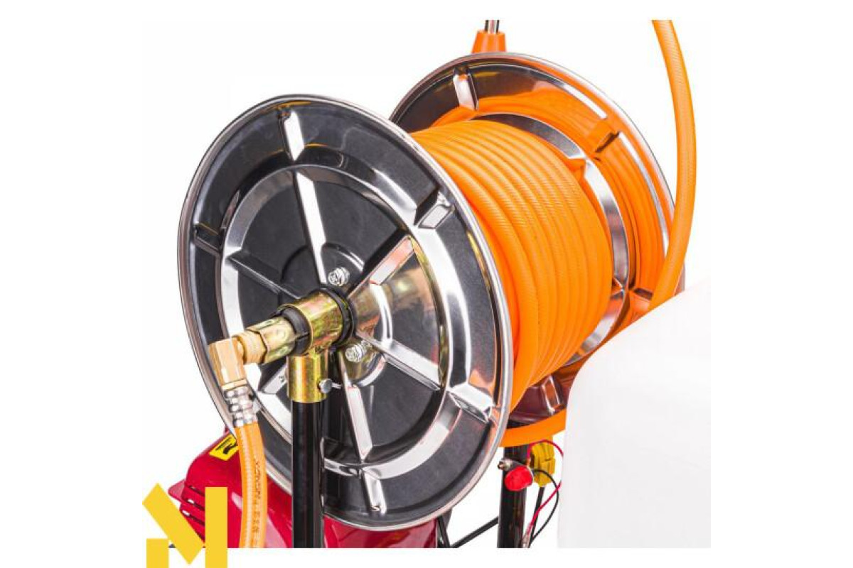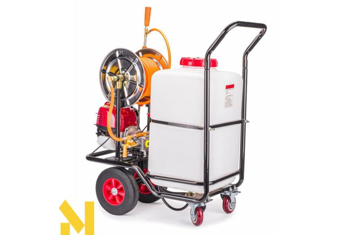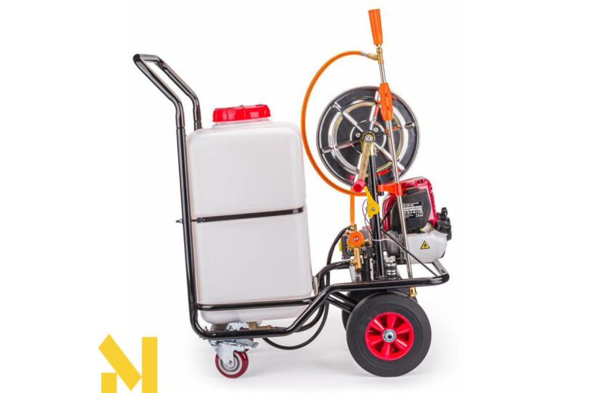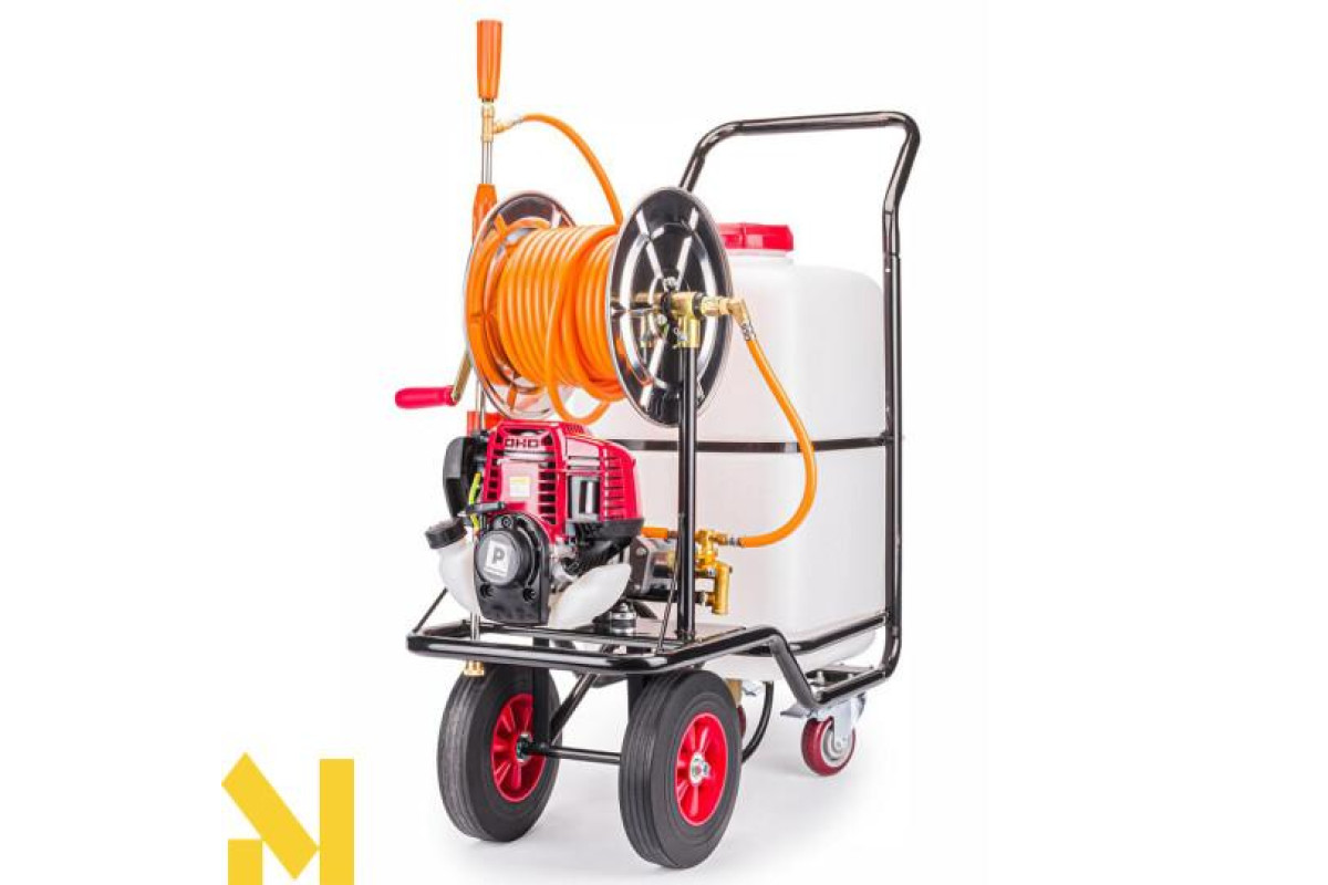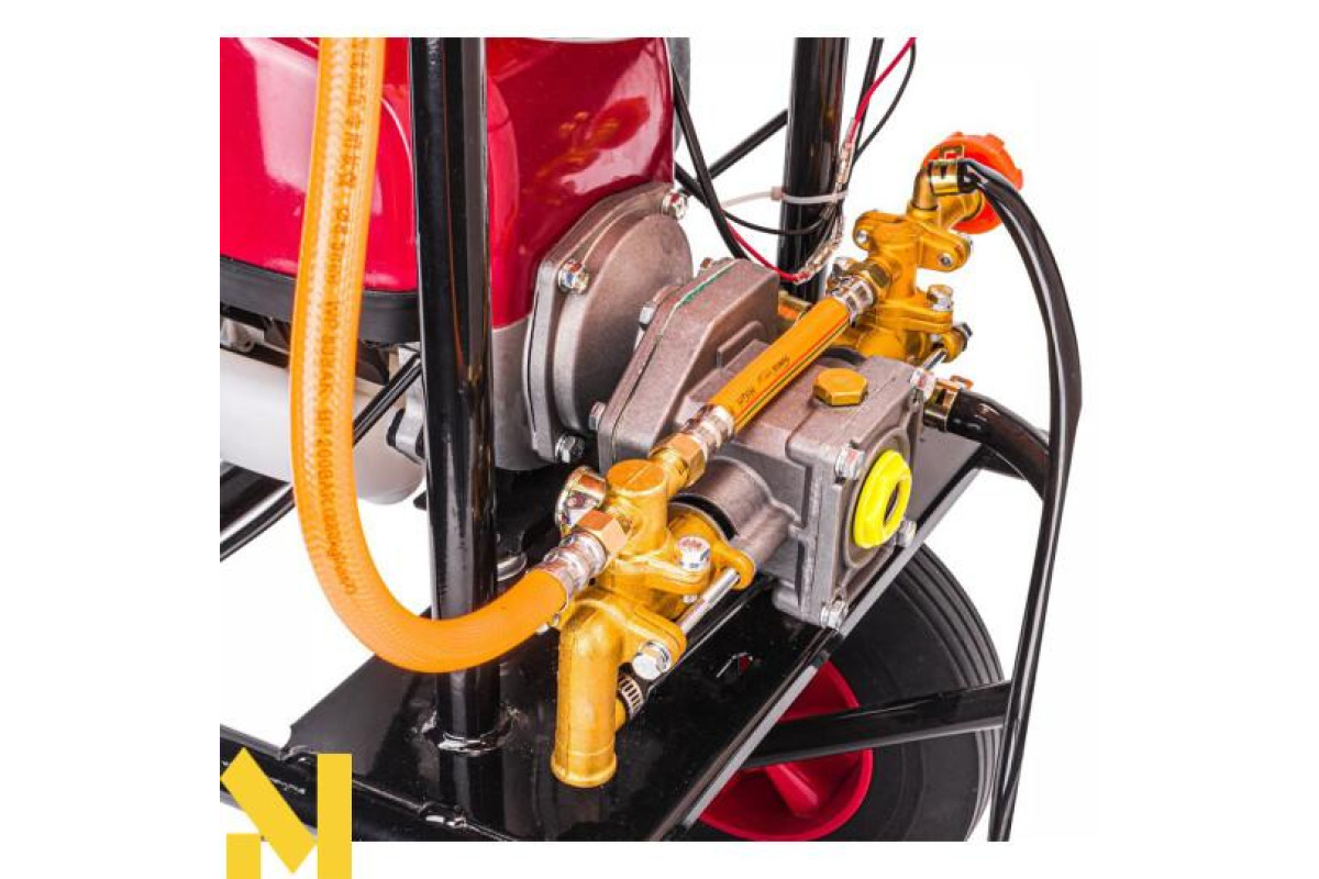 Потужний чотиритактний двигун забезпечує великий регульований тиск, завдяки чому обприскувач має досить великий радіус дії.