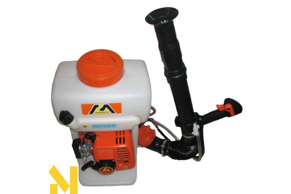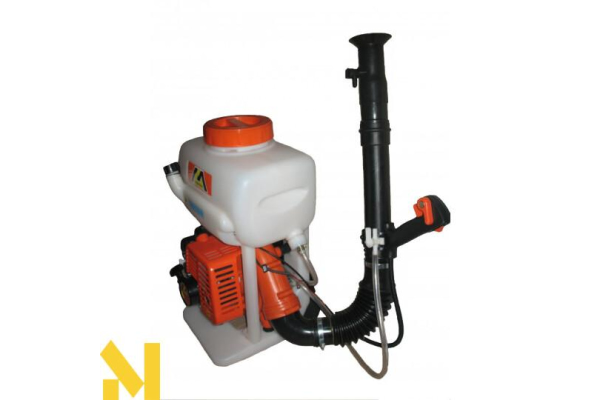 Бензооприскувач оснащений 2-х тактним двигуном з об'ємом 43 см3. Ємність бака 14 л. А продуктивність становить до 3 л/хв. рідини і до 5 кг/хв. в порошку. Важливо знати, що важіль дросельної заслінки розташований відразу перед оператором на розтрубі. Комплектується техніка ще двома насадками для обприскування.