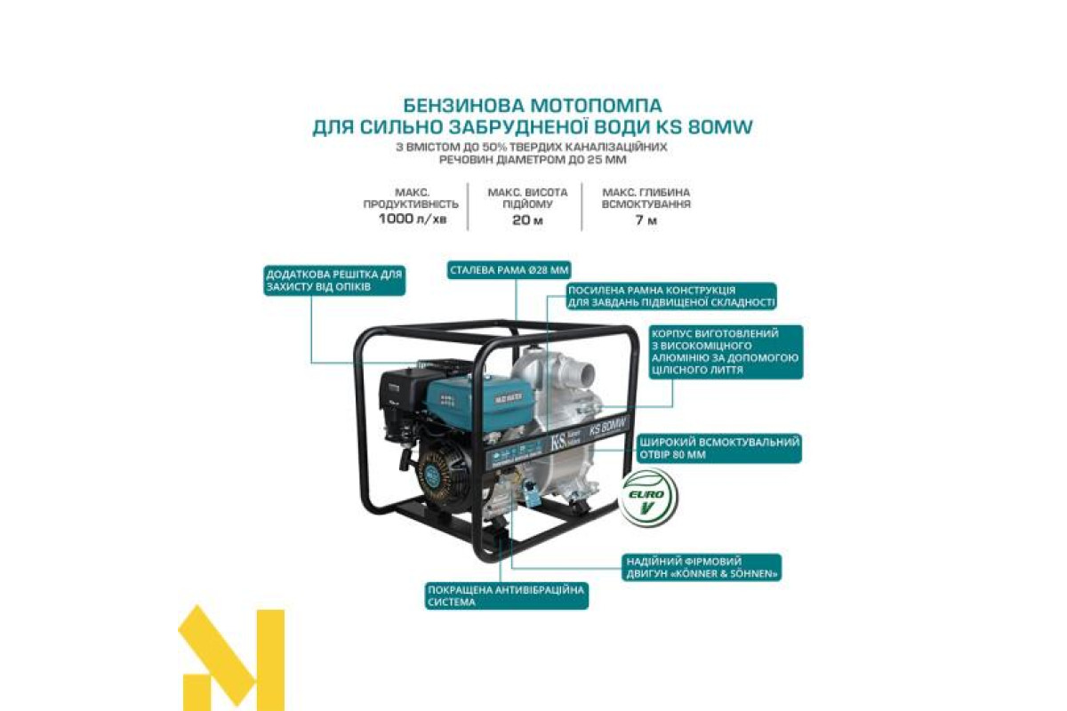 Мотопомпа для сильно забрудненої води підходить для перекачування брудної води з вмістом твердих каналізаційних речовин до 50% і діаметром до 25.4 мм. Перед початком роботи насос помпи необхідно заповнити чистою водою. Після старту помпу потрібно зупинити через 30 секунд після запуску і долити воду в помпу для збільшення продуктивності.