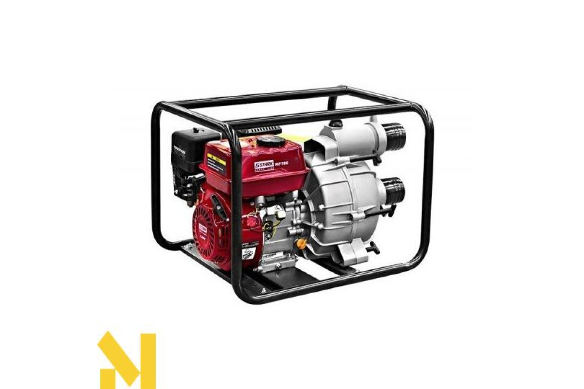 Stark WPT 80 - мотопомпа бензинова, призначена для зрошення городів і садових ділянок, водопостачання дач та котеджів, осушення басейнів, аварійної подачі води та її відкачки (розмір часток до 2,5 см).