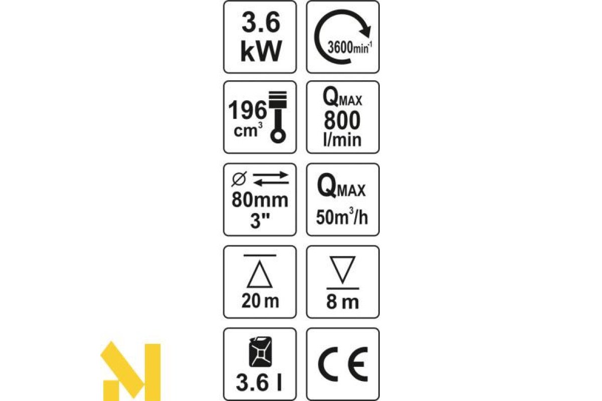 Насос призначений для перекачування великих об'ємів води. Для рятувальних робіт при аваріях і несприятливих метеоумовах. Насос і двигун укладені в сталевій рамі, яка захищає від пошкоджень і полегшує транспортування.