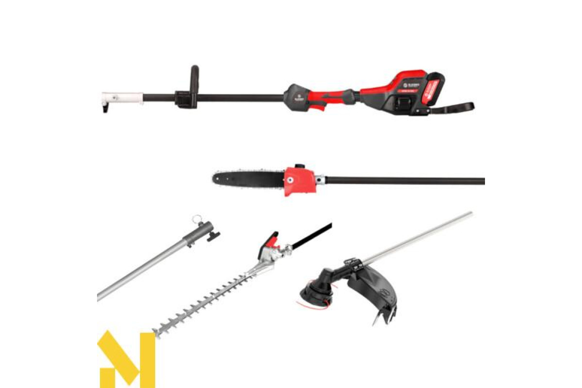 Придбання мультисистеми COMBI включає різноманітні необхідні аксесуари, такі як кущоріз, тример, висоторіз та подовжувач. Крім того, постачається літієва батарея 21 В ємністю 5 Аг, що гарантує достатню автономність. У комплект поставки також входить зарядний пристрій для акумулятора та інструменти, необхідні для складання та використання набору.