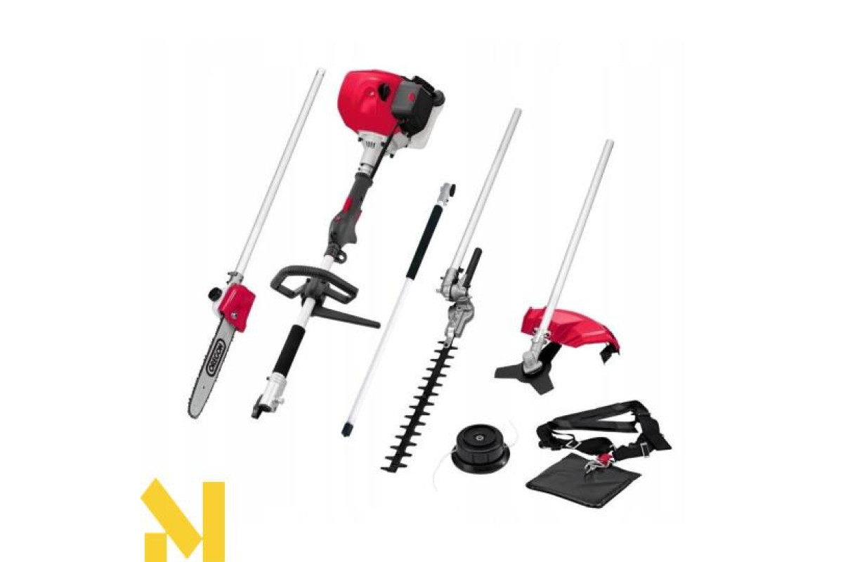 Цей пристрій оснащений низкою різних аксесуарів, таких як металеве тризубе лезо, тримери для живоплоту, бензопила, подовжувач та тример з автоматичною ударною головкою.