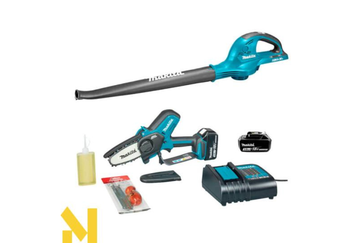Набір садових інструментів від Makita складається зі ланцюгової мініпили DUC101SF, до якої у комплекті є 18 В батарея на 3 Агод, зарядний DC18SD й інші аксесуари, та повітродувки DUB361Z. Бездротові інструменти потужні, маневрені. Вони допоможуть зрізати гілки кущів і дерев, очистити прибудинкову ділянку від дрібного сміття. Доставляються у картоні.