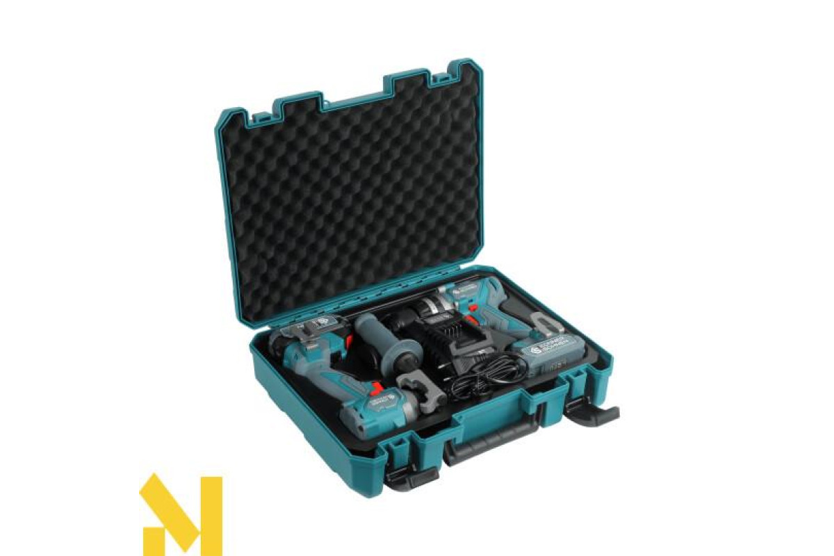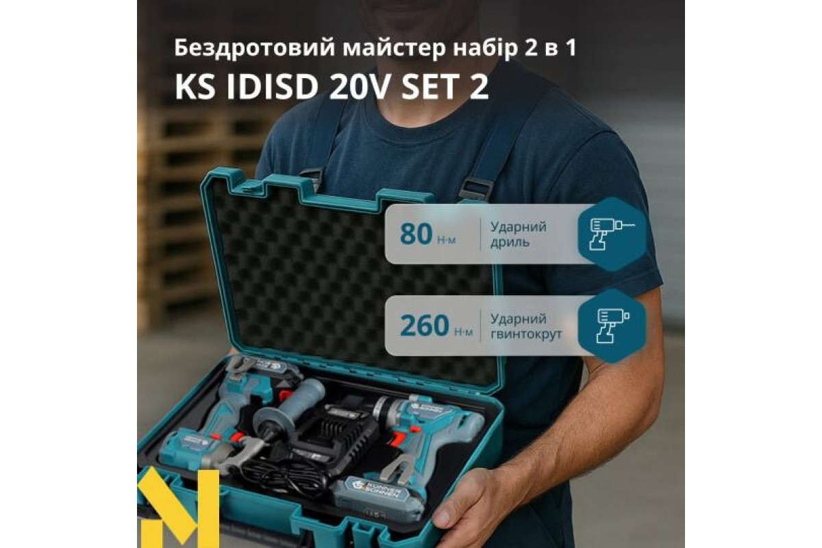 KS IDISD 20V SET 2 — бездротовий комплект «2 в 1».Набір містить ударний дриль (80 Н·м) із трьома режимами роботи та 22 положеннями крутного моменту, а також ударний гвинтокрут (260 Н·м) із чотирма швидкостями, швидкороз’ємним патроном 1/4″, що дозволяє миттєво міняти бітові насадки, трьома режимами закручування й функцією «Автостоп». Обидва інструменти оснащені безщітковими двигунами, LED-підсвіткою, реверсом, електронним перемиканням режимів, гумовими рукоятками та петлею для ременя для максимального комфорту під час роботи. Система захисту від перегріву та перевантаження гарантує безпеку й довговічність. Два акумулятори 20 В 2 А·год і швидкий заряд 2 А забезпечують безперервну роботу.
