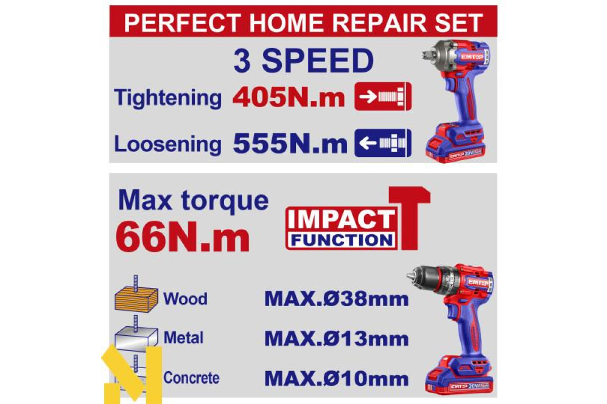 Дриль-шуруповерт ударний акумуляторний EMTOP ECIDL206681 | |