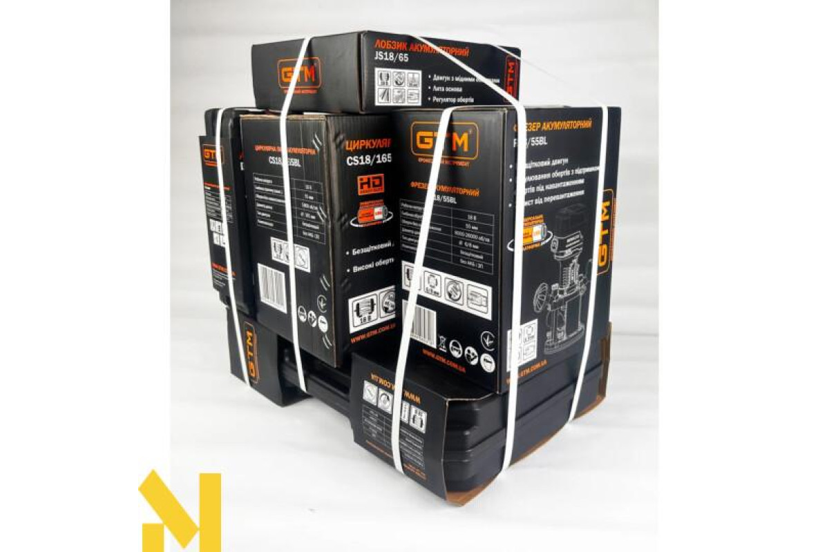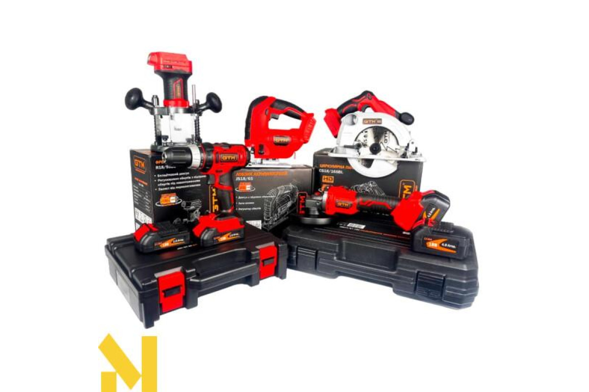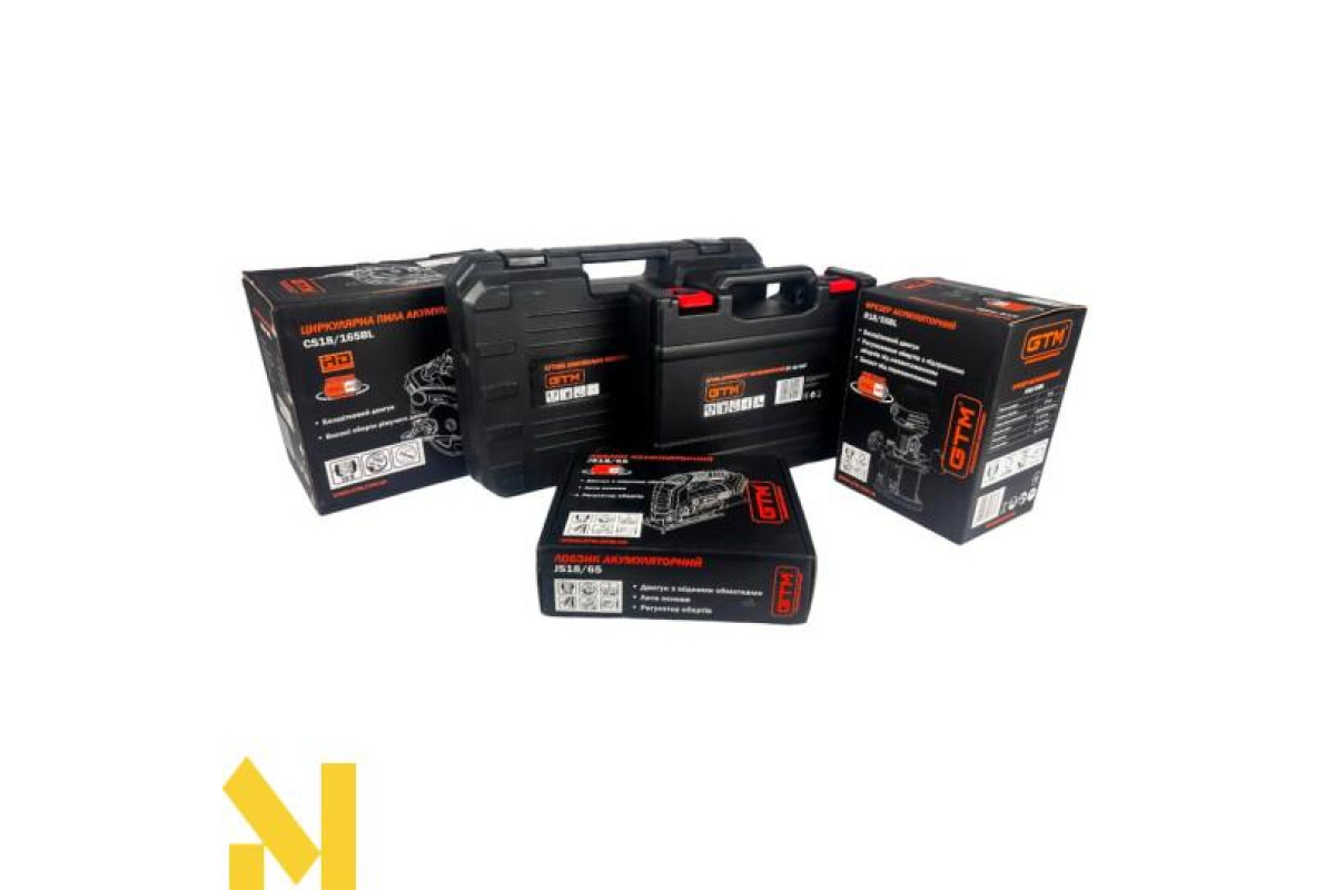 GTM PROMO_4 - лімітований набір акумуляторного інструменту, для виконання основних завдань з ремонту. До комплекту входять потужний акумуляторний шурупокрут DS18/40P, лобзик JS18/65, болгарка AGC18/125BL, фрезер R18/55BL, дискова пила CS18/165BL, 2 Li-on акумулятори ємністю 2 Аг, 2 Li-on акумулятори ємністю 4 Аг і зарядний пристрій.