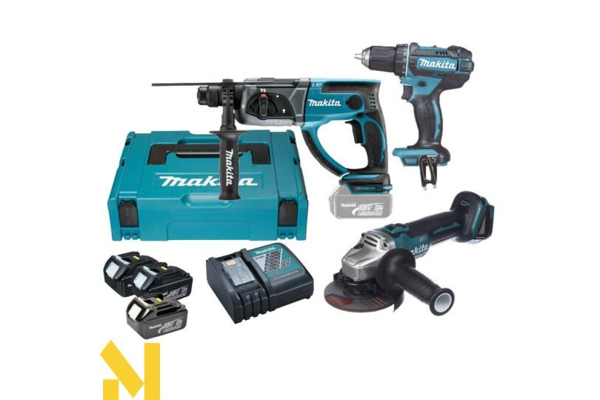 Makita DLXMUA504B - це набір акумуляторних інструментів 18 В для виконання різних завдань по будівництву та ремонту. У набір входять болгарка DGA504z, дриль-шуруповерт DDF482z, перфоратор DHR202z, 3 акумулятора BL1830, зарядний пристрій DC18RC, кейс MakPac