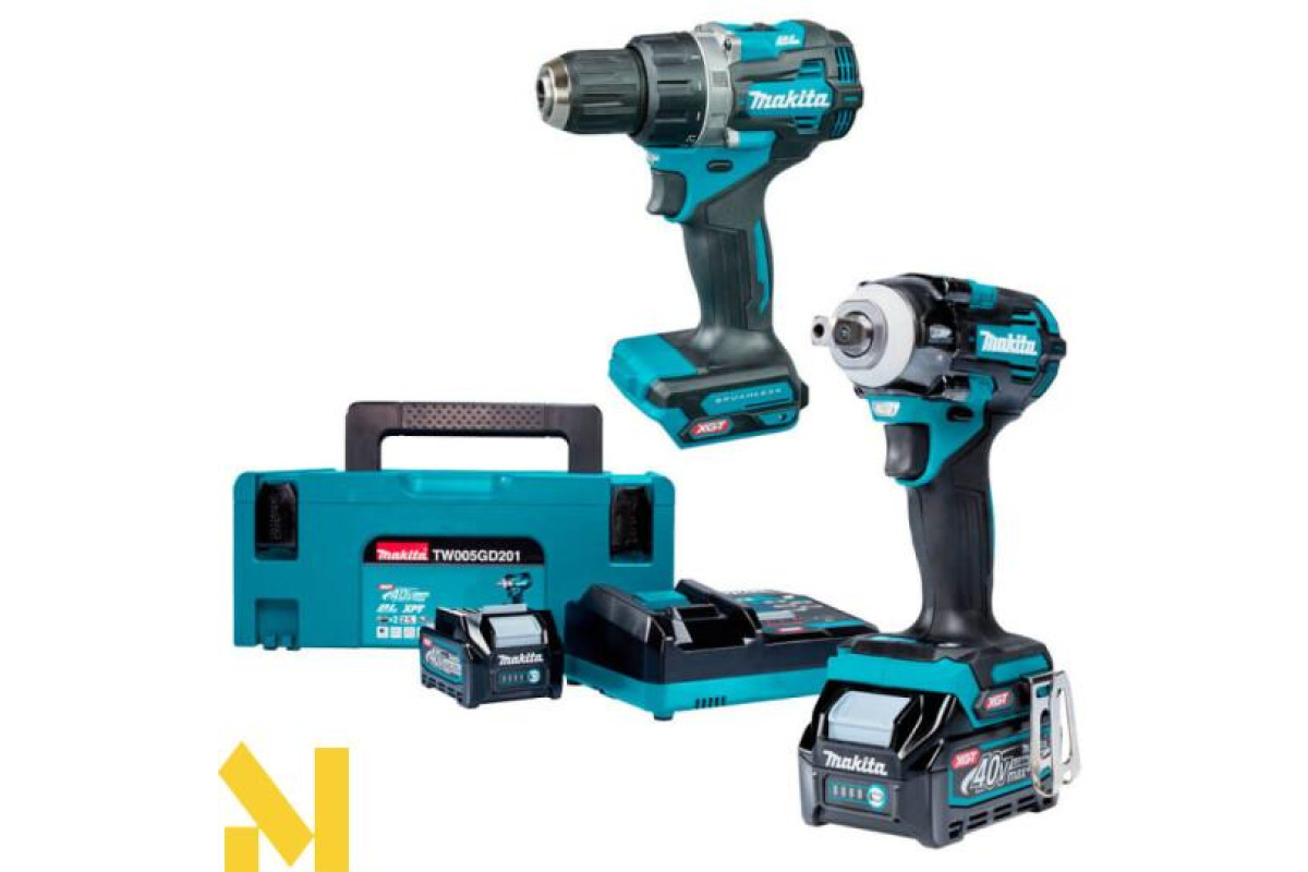 Набір акумуляторних інструментів складається зі 4-швидкісного гайковерта Makita TW005GZ, 2-швидкісного дриля-шуруповерта DF002G, пари батарей BL4020, зарядного пристрою DC40RA, валізи Makpac. Вмонтовані безщіткові двигуни стійкі до перегріву та перенавантаження, розвивають високий момент сили, низькошумні та потребують мінімального техобслуговування. Бездротові інструменти відносяться до промислової лінійки XGT, оснащені технологією XPT — захисту від пилу та вологи.