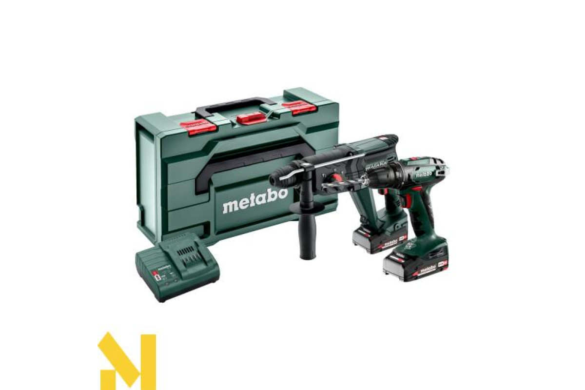 Комплект інструменту Metabo Combo 2.3.2 18 V складається з акумуляторного шуруповерта Metabo BS 18, акумуляторного перфоратора Metabo KH 18 LTX 24 та двох акумуляторів Li-Power 18 В/2,0 Аг із зарядним пристроєм.