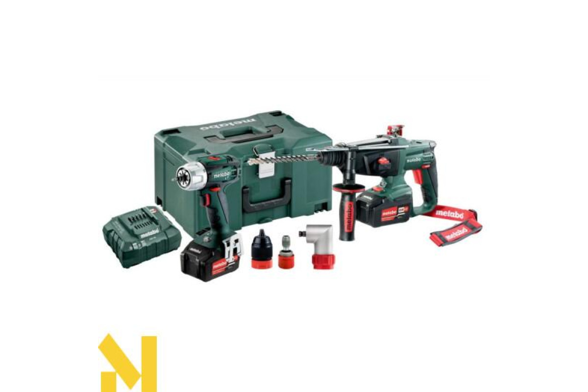 Комплект інструменту Metabo Combo 2.3.3 18 V складається з акумуляторного шуруповерта з системою Quick Metabo BS 18 LT Quick, акумуляторного перфоратора Metabo KHA 18 LTX, двох акумуляторів Li-Power 18 В / 4,0 Ач із зарядним пристроєм, кутові насадки і тримача біт Quick.