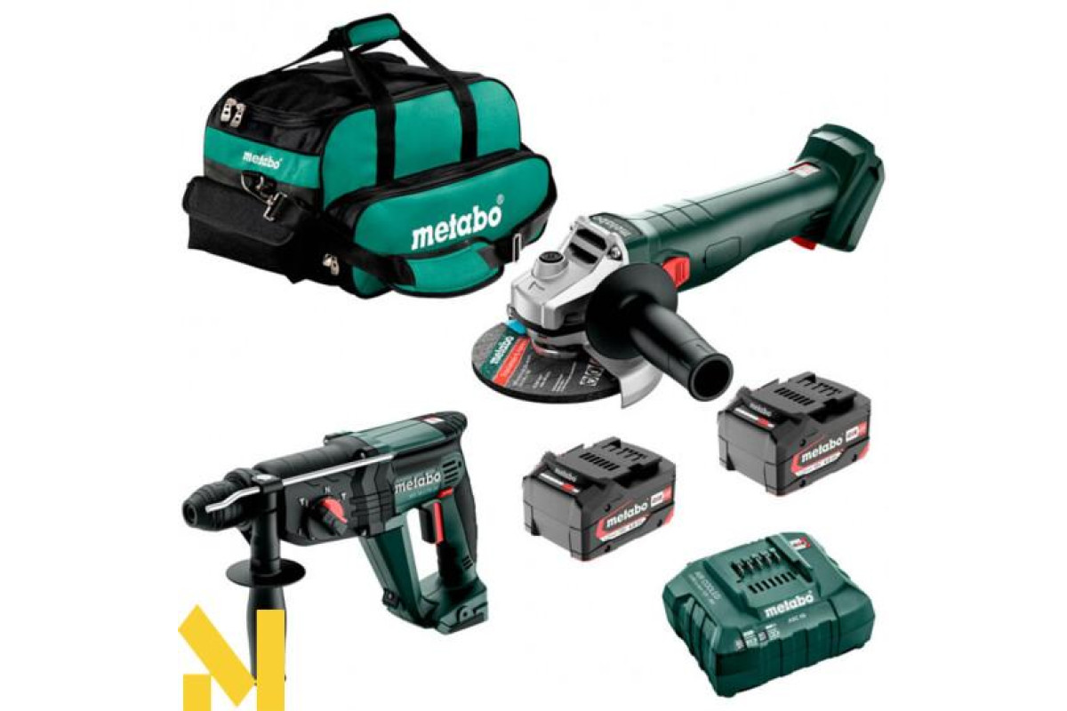 Два акумуляторних інструменти — перфоратор Metabo KH 18 LTX 24 і кутова шліфувальна машина W 18 7-125 — у комплекті з двома елементами живлення 18V 4 Ah та зарядним пристроєм ASC 55 надають максимальну гнучкість й універсальність у роботі. Незамінні в умовах, де доступ до електричної мережі обмежений або відсутній. Цей набір ідеально підходить для різних завдань у будівництві, ремонті.