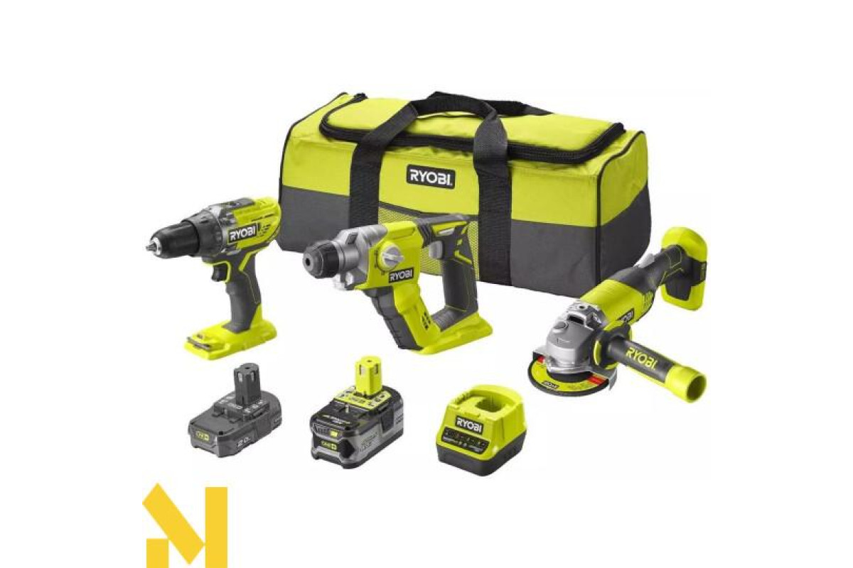 Комбінований набір включає акумулятор 2,0 А·год (RB18L20), акумулятор 4,0 А·год (RB18L40) і зарядний пристрій 2,0 А (RC18120). Все упаковано в упаковку для інструментів