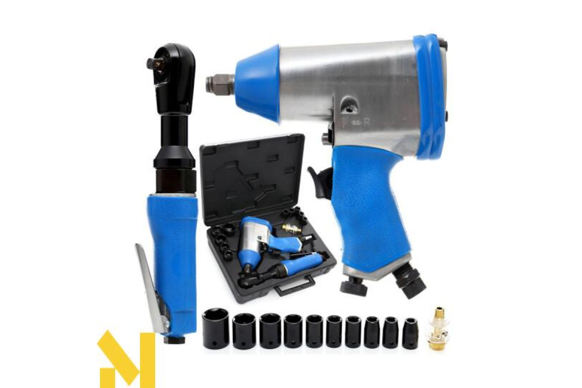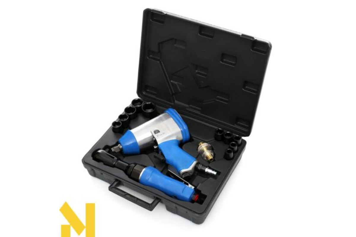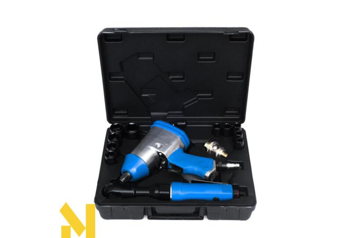 Дуже практичний пневматичний набір, що складається з пневматичного ударного гайкового ключа на 1/2 дюйма і пневматичної тріскачки на 3/8 дюйма. Насадки, що входять до комплекту, виготовлені зі спеціального типу хромованадієвої сталі (CrV).